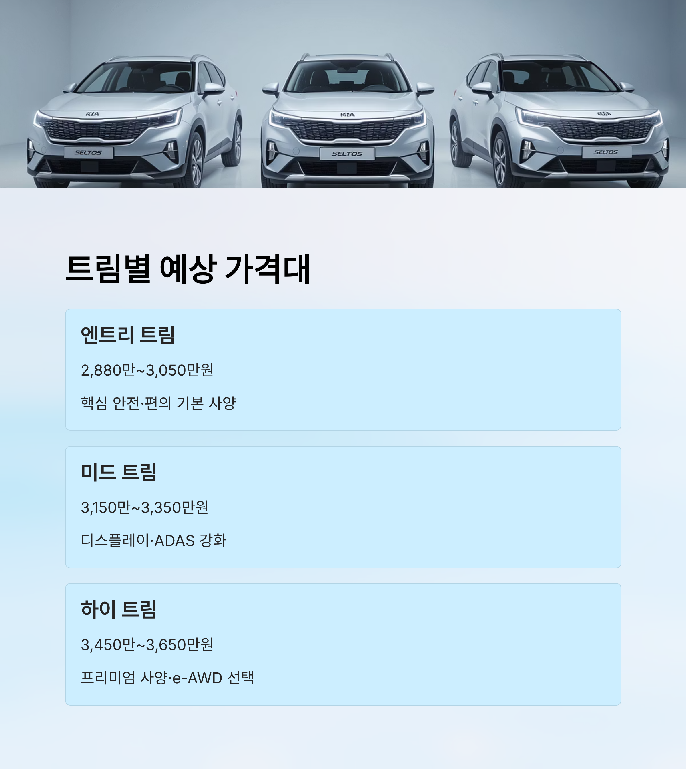 셀토스 하이브리드는 소형 SUV 중심 가격대를 유지하되, 하이브리드 시스템과 신규 디자인·안전 사양 반영으로 가솔린 대비 300~500만 원가량 높아질 가능성이 커요. 엔트리 트림은 접근성을, 상위 트림은 ADAS·디스플레이·사운드·시트 패키지 등 체감 사양을 강조하는 구조가 예상돼요. 동급 코나 하이브리드와 비슷하거나 약간 상회하는 수준으로 그려지지만, 공간과 e-AWD 가능성 같은 ‘가치’로 간극을 메우는 전략이 유력해요.