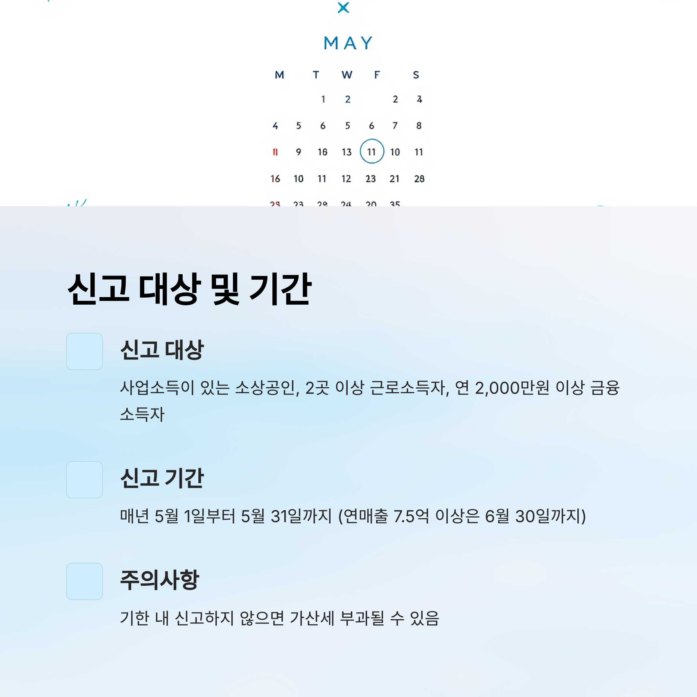 - 🔄 **기한 후 신고 가능**: 5월 31일 이후라도 신고하면 가산세는 부과되지만 불이익을 줄일 수 있어요.