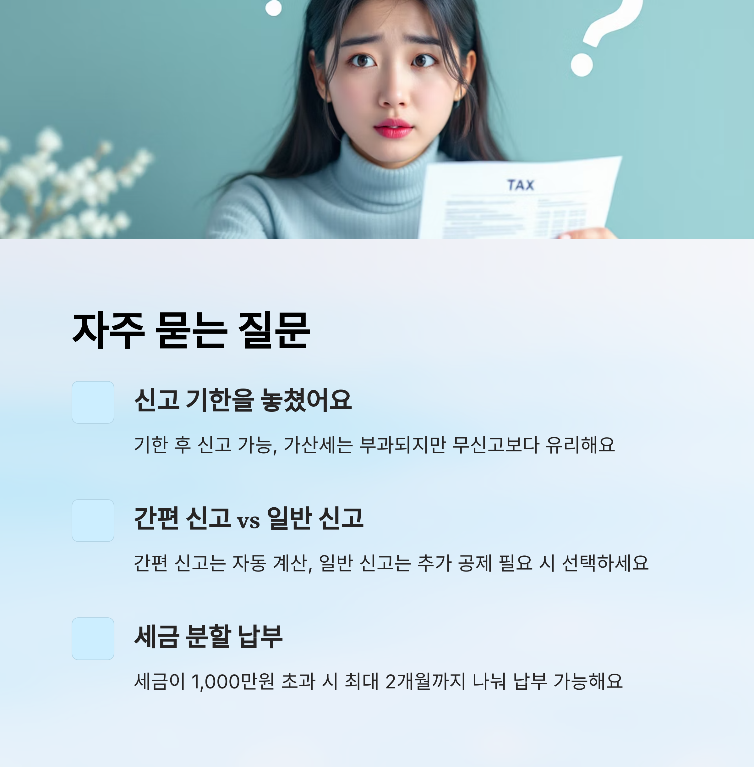A8. 무신고 가산세(세액의 20%)와 납부 지연 가산세(하루 0.025%)가 부과될 수 있어요. 심한 경우 세무조사 대상이 될 수도 있으니 신고를 꼭 하세요!