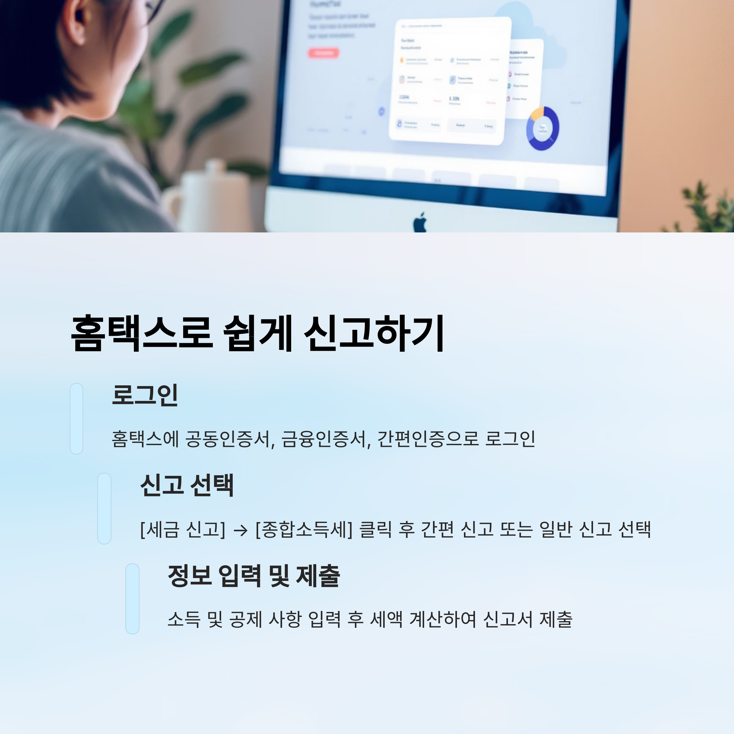 세무사 없이도 **홈택스**를 이용하면 쉽고 빠르게 종합소득세를 신고할 수 있어요. 국세청 홈택스는 사용자 친화적인 인터페이스를 제공하며, 안내 절차를 따라가면 초보자도 손쉽게 신고할 수 있답니다. 😊