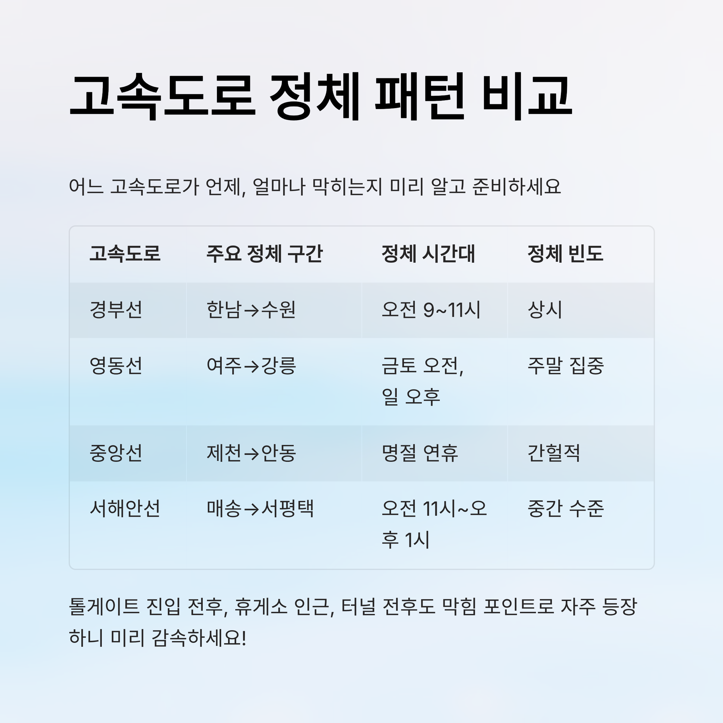 아래 표를 보면 전국 주요 고속도로들의 정체 구간과 시간대별 막힘 정도를 쉽게 비교할 수 있어요. 이걸 참고해서 본인에게 가장 적합한 도로를 선택해보세요!