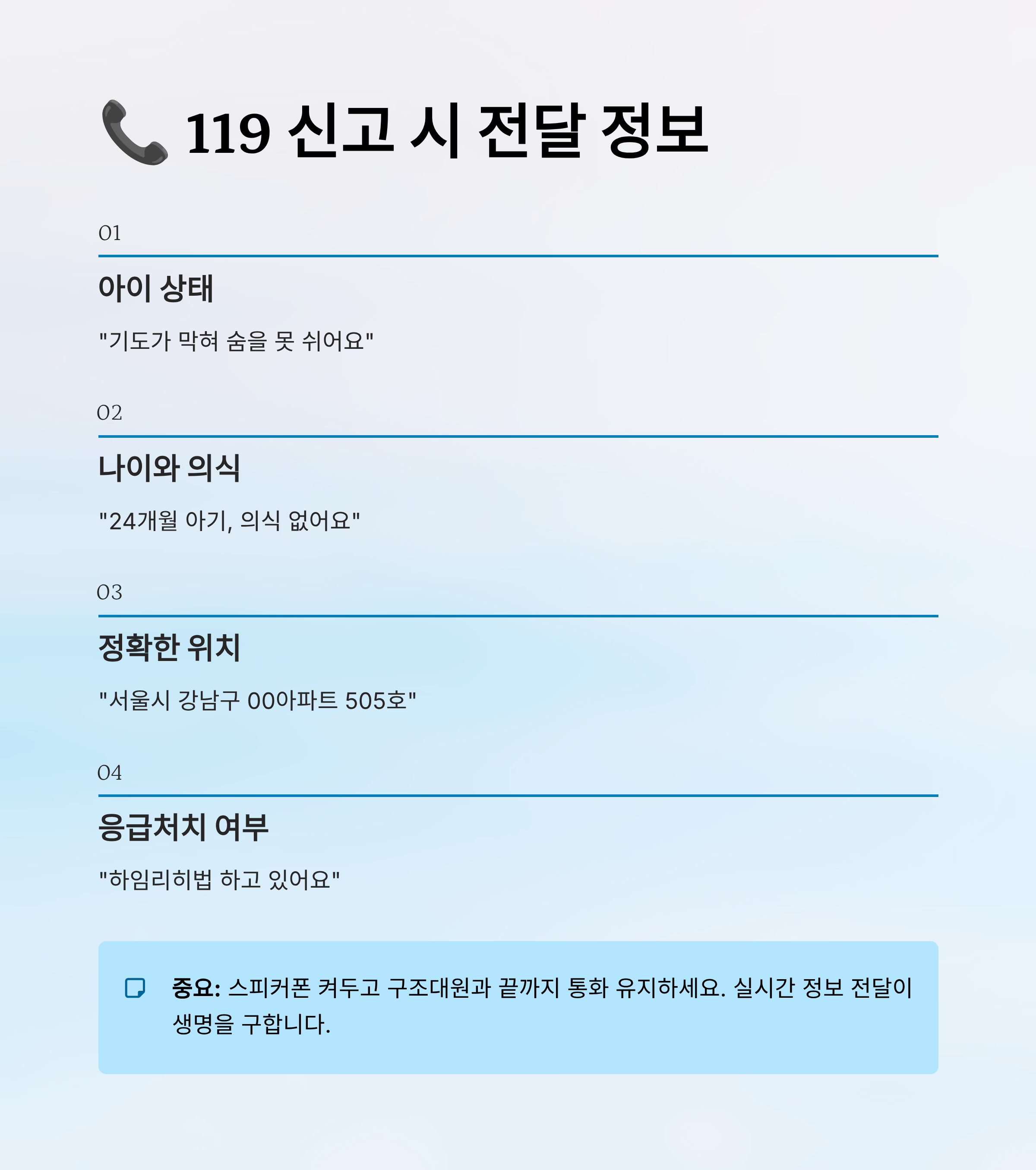 신고 시 첫 문장은 “아이 기도가 막혀 숨을 못 쉬어요”처럼 핵심 위주로 말하면 좋아요. 그 다음 아이의 나이, 의식 여부, 호흡 상태, 발생 위치 등을 순서대로 전달해 주세요. 예를 들면 “24개월 아기, 의식 없고 숨 못 쉬어요. 서울시 강남구 00아파트 101동 505호입니다.”처럼 말이에요.