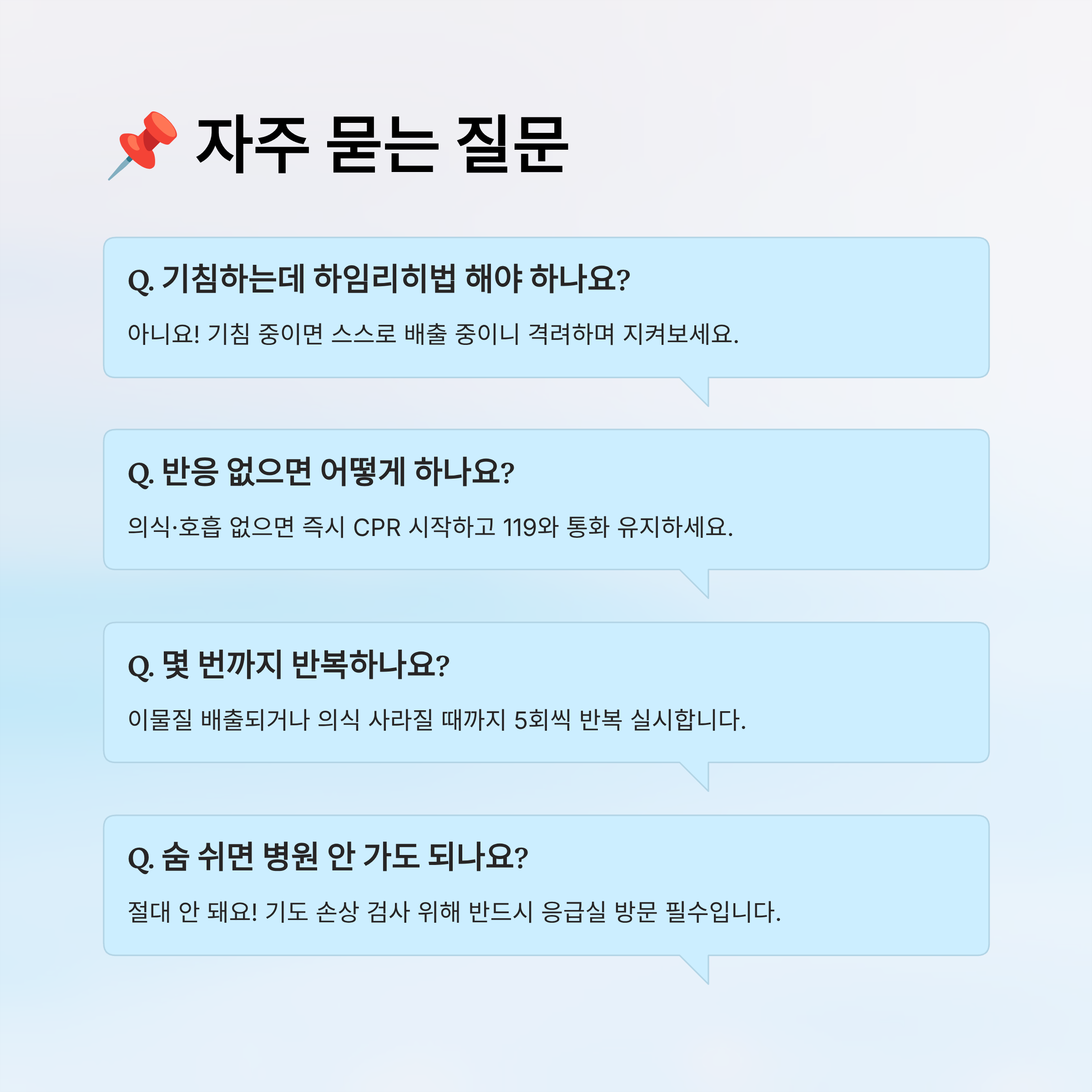A3. 이물질이 배출되거나 의식이 사라질 때까지 반복해요. 5회씩 나눠서 시도하면 좋아요.