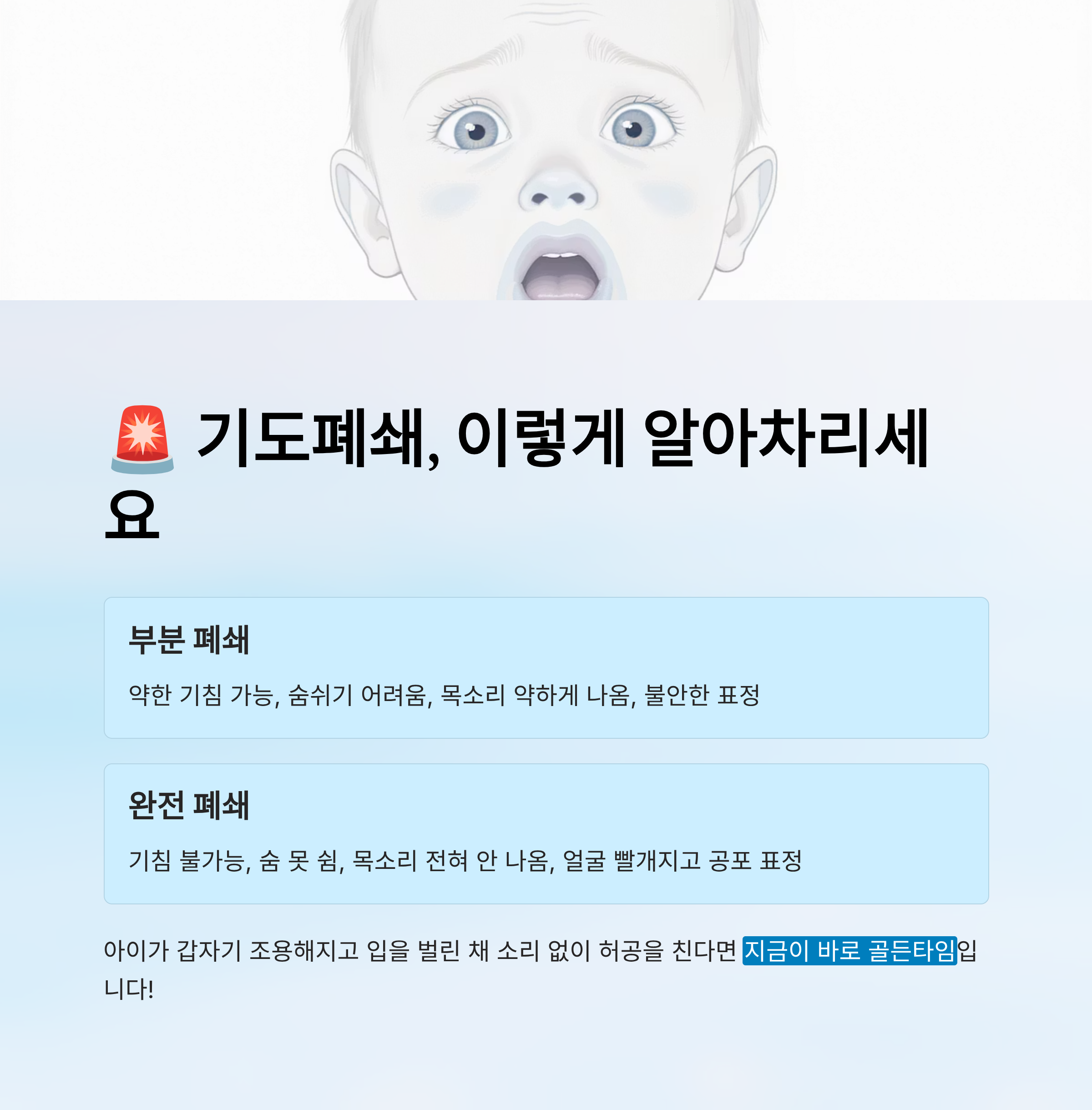 | 아이 상태 | “기도가 막혀 숨을 못 쉬어요” |