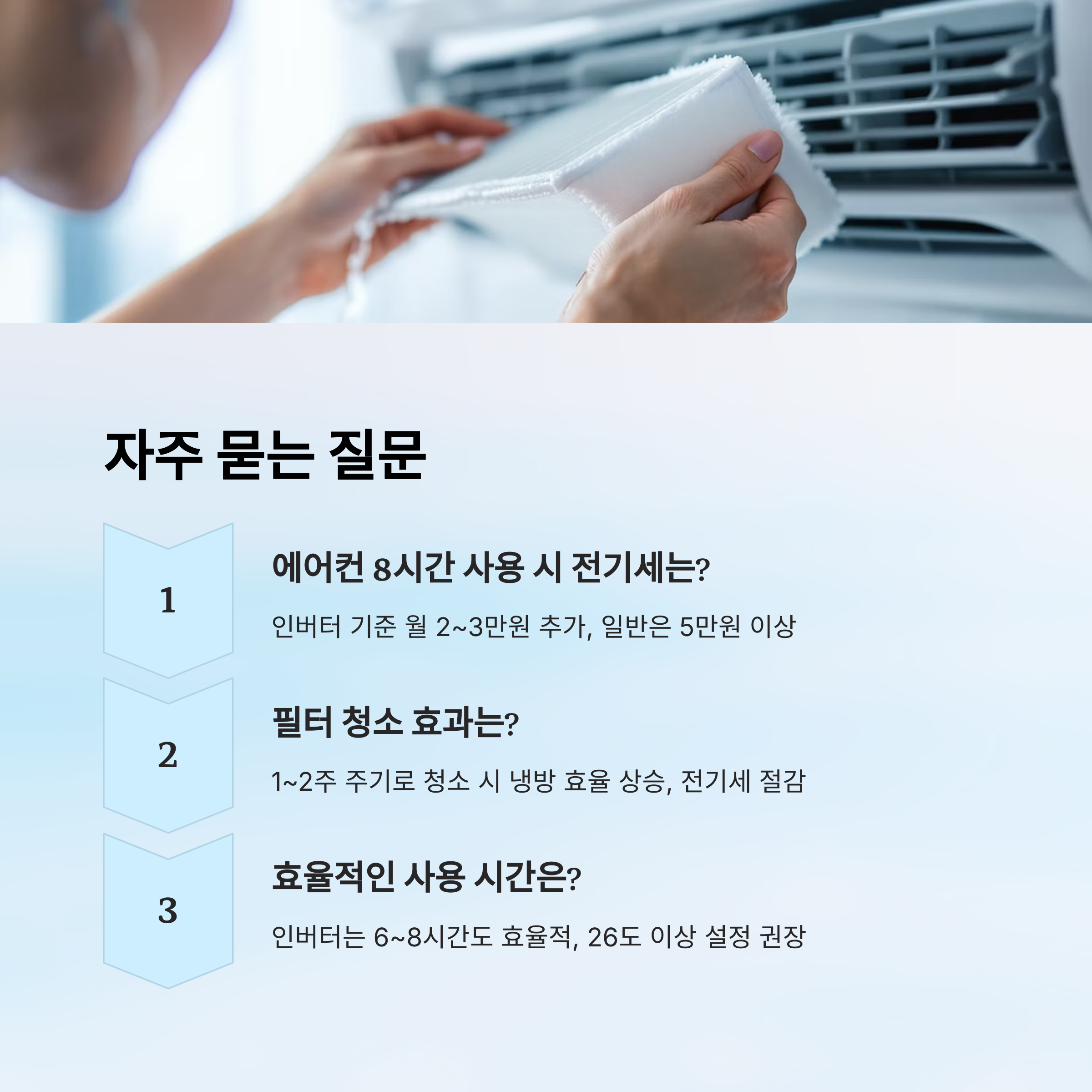 A8. 평균적으로 하루 4시간 이하가 가장 경제적이지만, 인버터 제품이라면 6~8시간도 효율적인 사용이 가능해요. 대신 26도 이상으로 설정하는 게 좋아요.