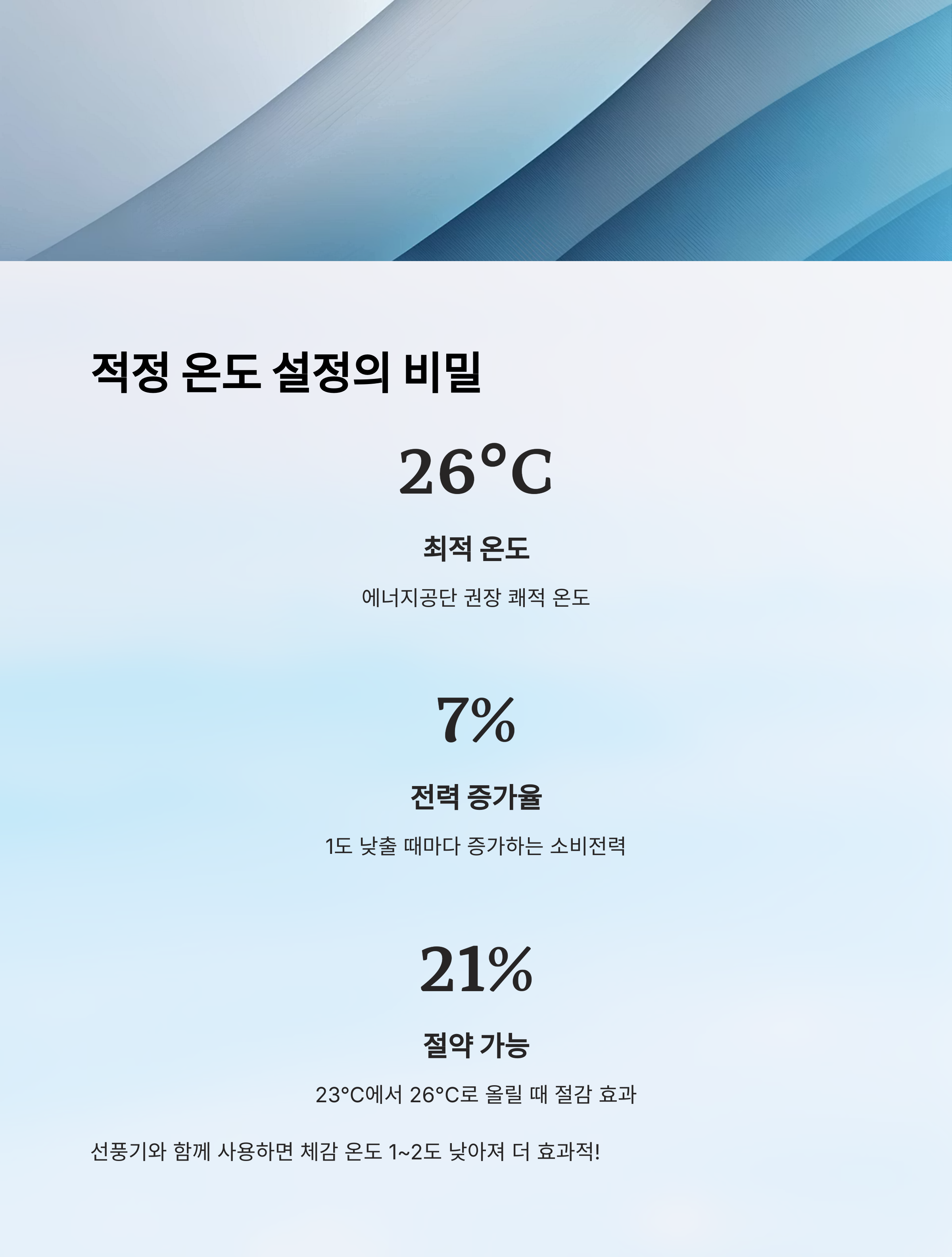 에어컨 전기세 절약의 핵심 중 하나는 바로 '온도 설정'이에요! 무조건 낮게 설정한다고 시원한 게 아니라, 효율적으로 설정해야 전기세가 덜 나와요. 에너지공단에 따르면 여름철 가장 효율적인 냉방 온도는 26도라고 해요. 이 온도는 쾌적하면서도 과한 전력 소비를 막을 수 있는 기준이에요.