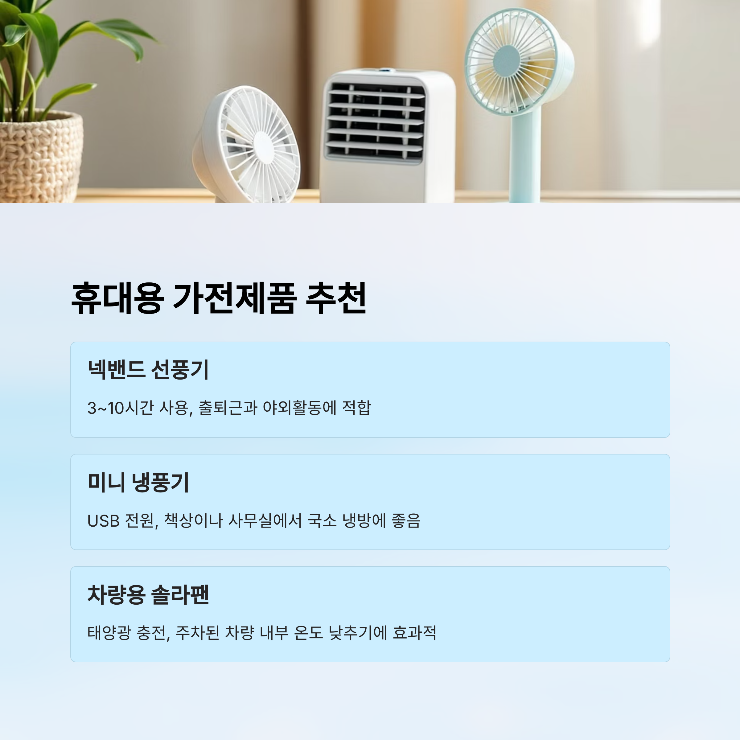 작지만 실속 있는 이 휴대용 가전들은 여름철 삶의 질을 크게 높여줘요. 야외 활동이 많은 분들이라면 꼭 하나쯤은 챙겨보세요! ☀️