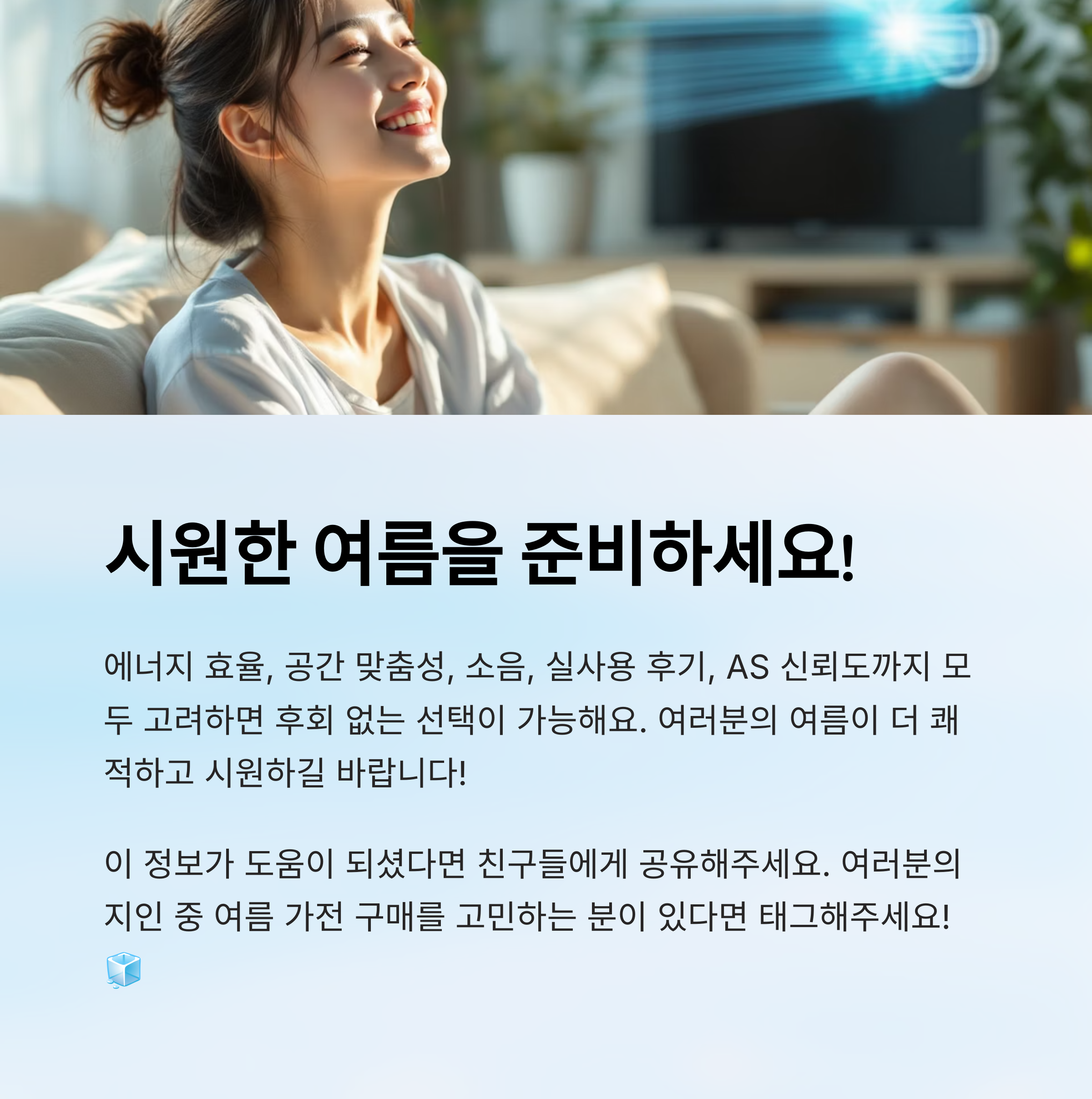 여름 냉방 기기 고를 땐 단순히 “센 바람”만 보는 것보다 에너지 소비량, 설치 편의성, 청소 여부까지 꼼꼼히 따지는 게 진짜 중요한 포인트예요! ☀️