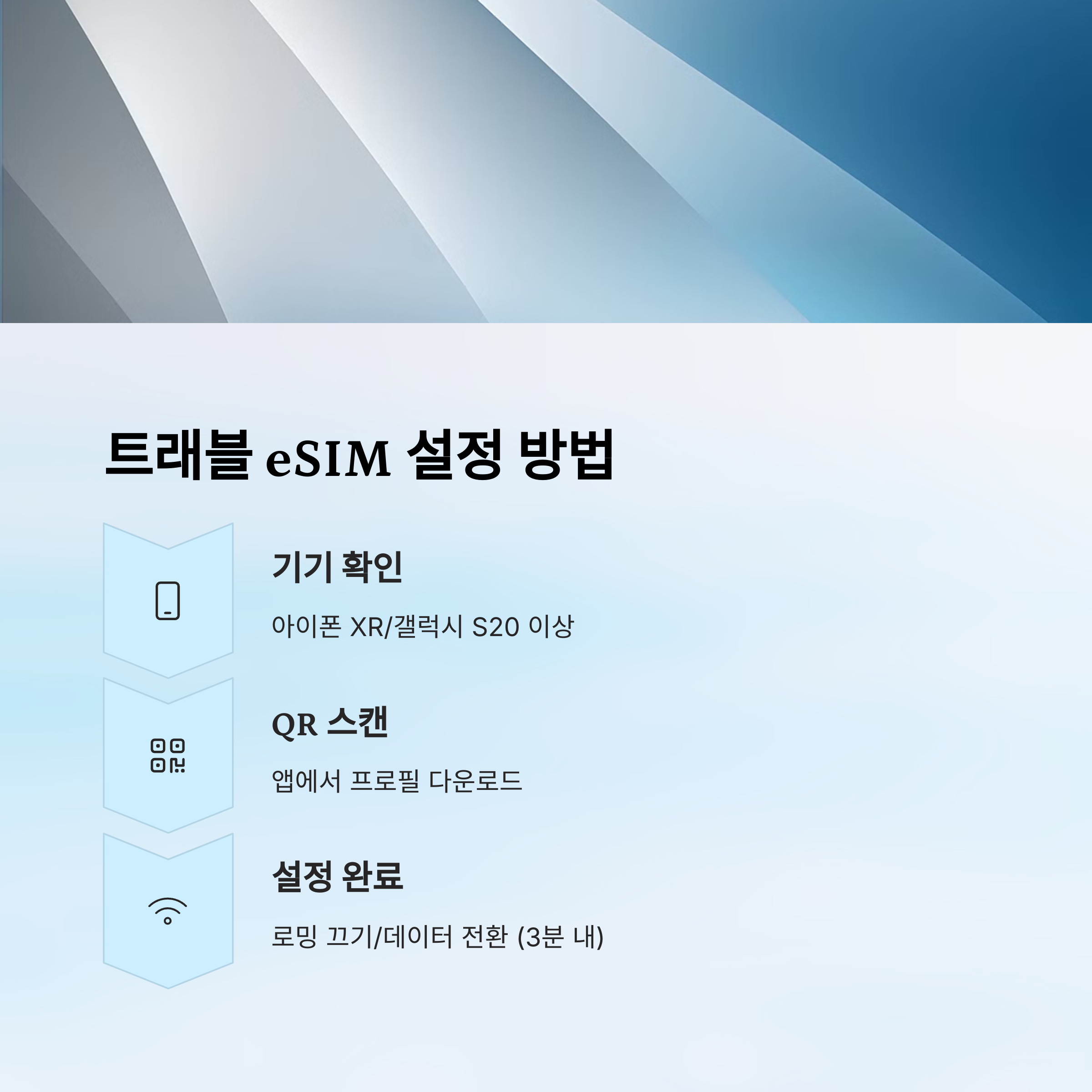 트래블 eSIM은 생각보다 설치가 간단해요. 보통 eSIM을 제공하는 사이트나 앱에서 원하는 국가와 데이터량을 선택한 뒤, 결제를 완료하면 QR 코드 또는 수동 설정 정보가 제공돼요. 📧