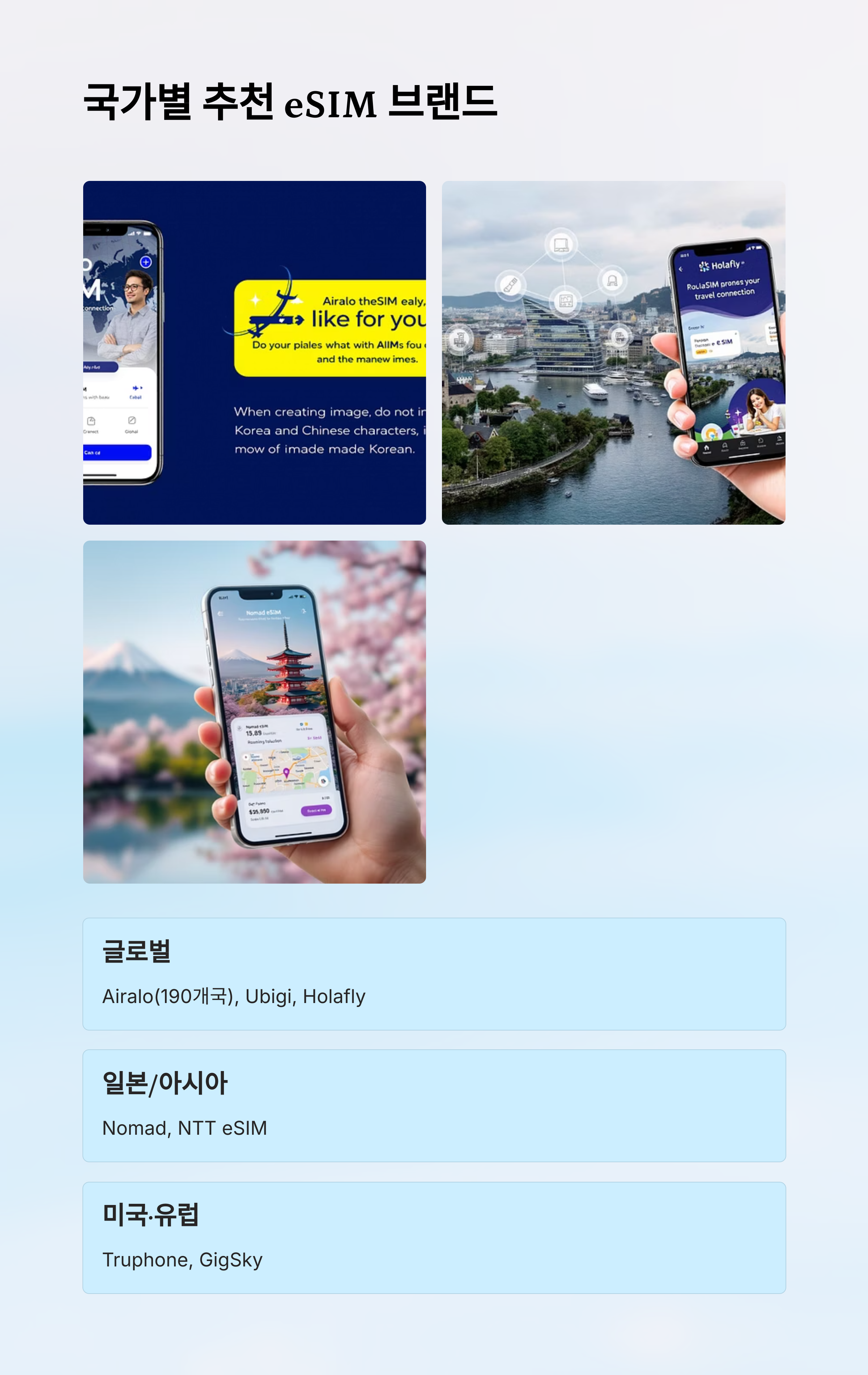 eSIM도 통신사마다 조금씩 품질과 요금이 달라요. 그래서 여행 목적지에 따라 잘 맞는 브랜드를 선택하는 게 중요해요. 지금부터 인기 있고, 사용 후기 좋은 브랜드들을 지역별로 정리해볼게요.