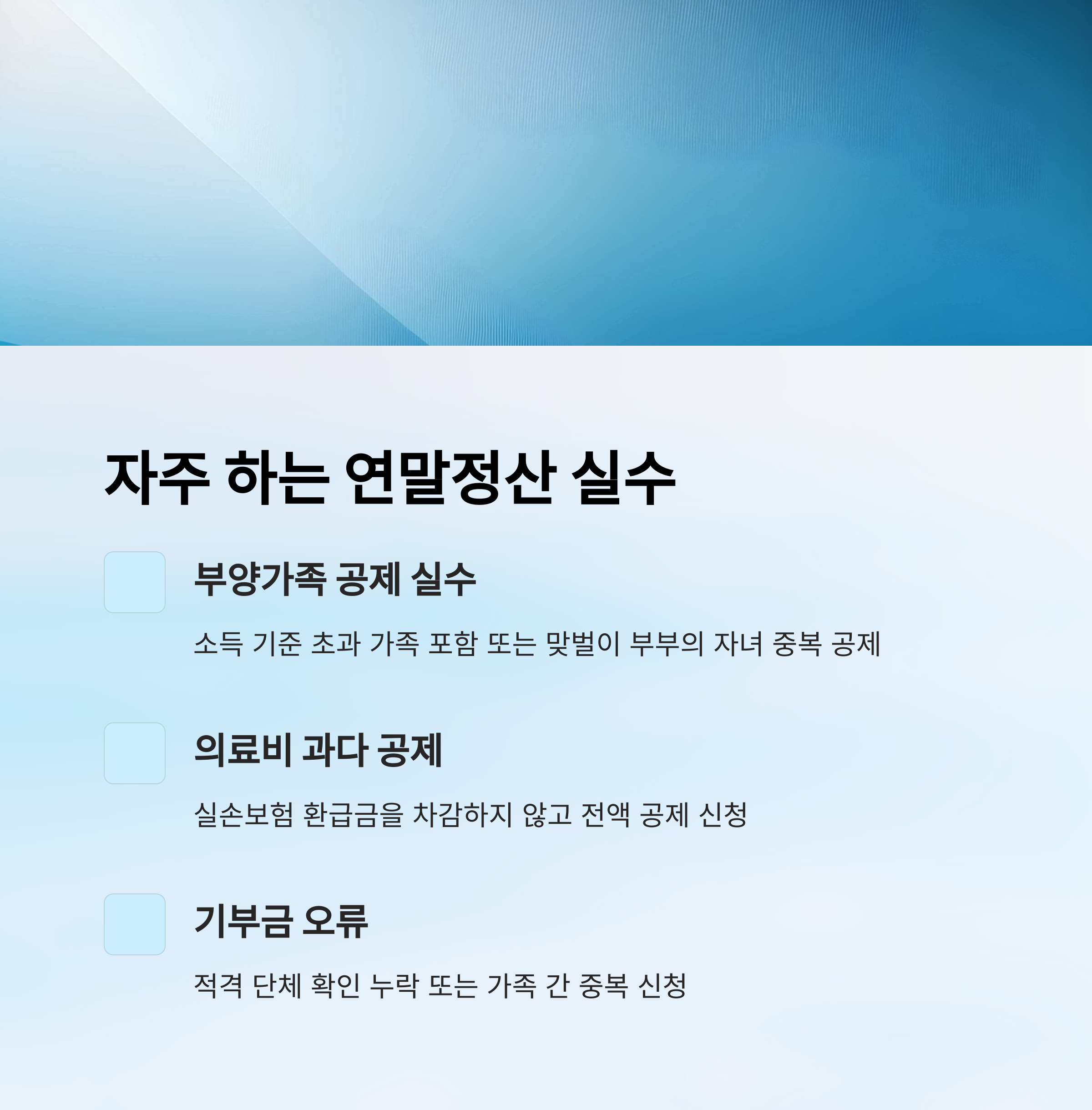 연말정산 실수는 생각보다 흔하게 발생해요. 특히 부양가족 공제, 주택자금 공제, 기부금 처리 등에서 실수가 자주 나오는데요. 가장 대표적인 실수는 '부양가족 공제 요건 미확인'이에요. 부모나 자녀의 소득이 일정 기준을 넘으면 공제를 받을 수 없는데도 무심코 포함하는 경우가 많죠.