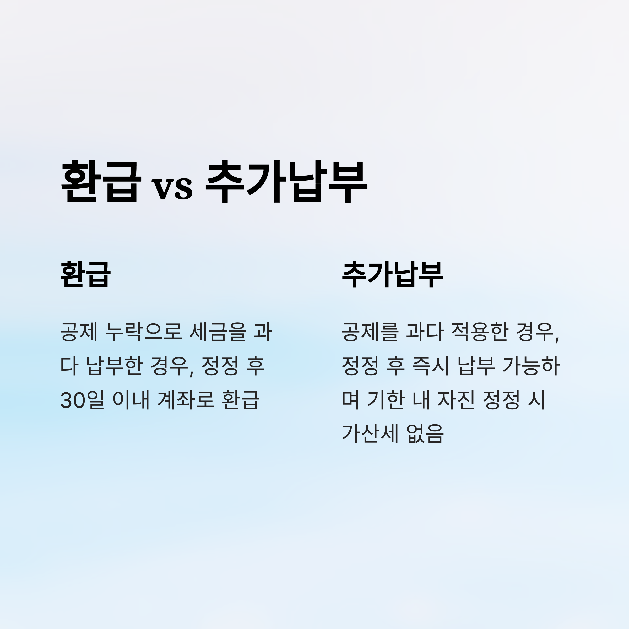 | 발생 원인 | 공제 누락으로 세금 과다 납부 | 공제 과다 적용으로 세금 덜 납부 |
