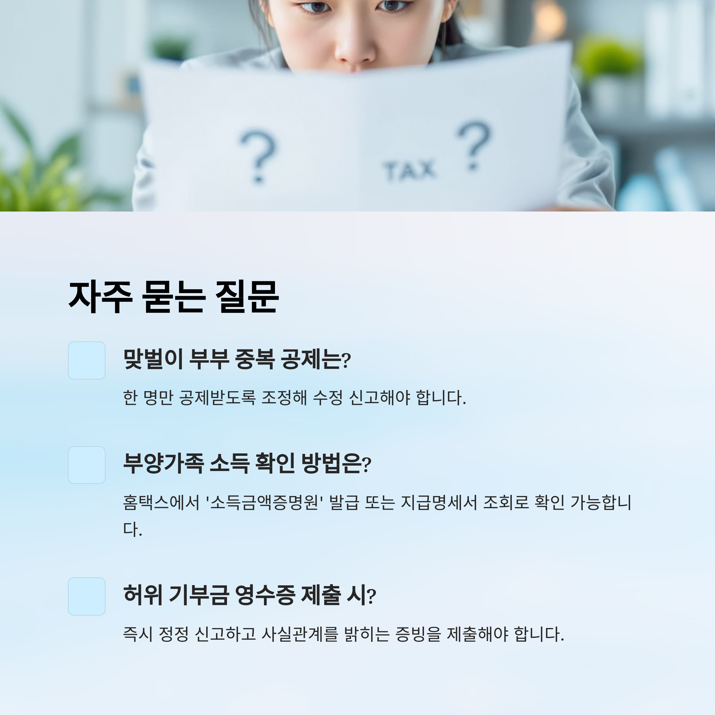 A6. 한 명만 공제받도록 조정해 수정 신고하면 돼요. 중복 공제 시엔 세액공제가 무효 처리될 수 있어요.