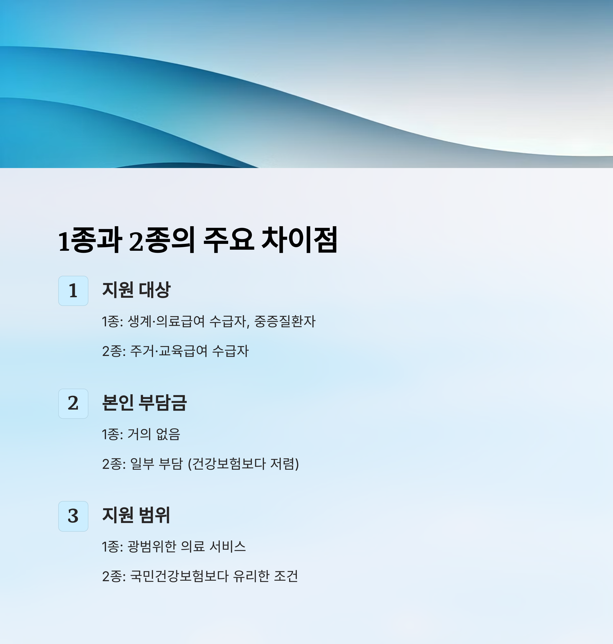 특히 **1종 수급자는 거의 모든 의료비를 지원받을 수 있는 반면, 2종은 일부 본인 부담금이 있어요.** 하지만 여전히 국민건강보험 가입자보다 낮은 부담으로 의료 서비스를 이용할 수 있답니다. 📉