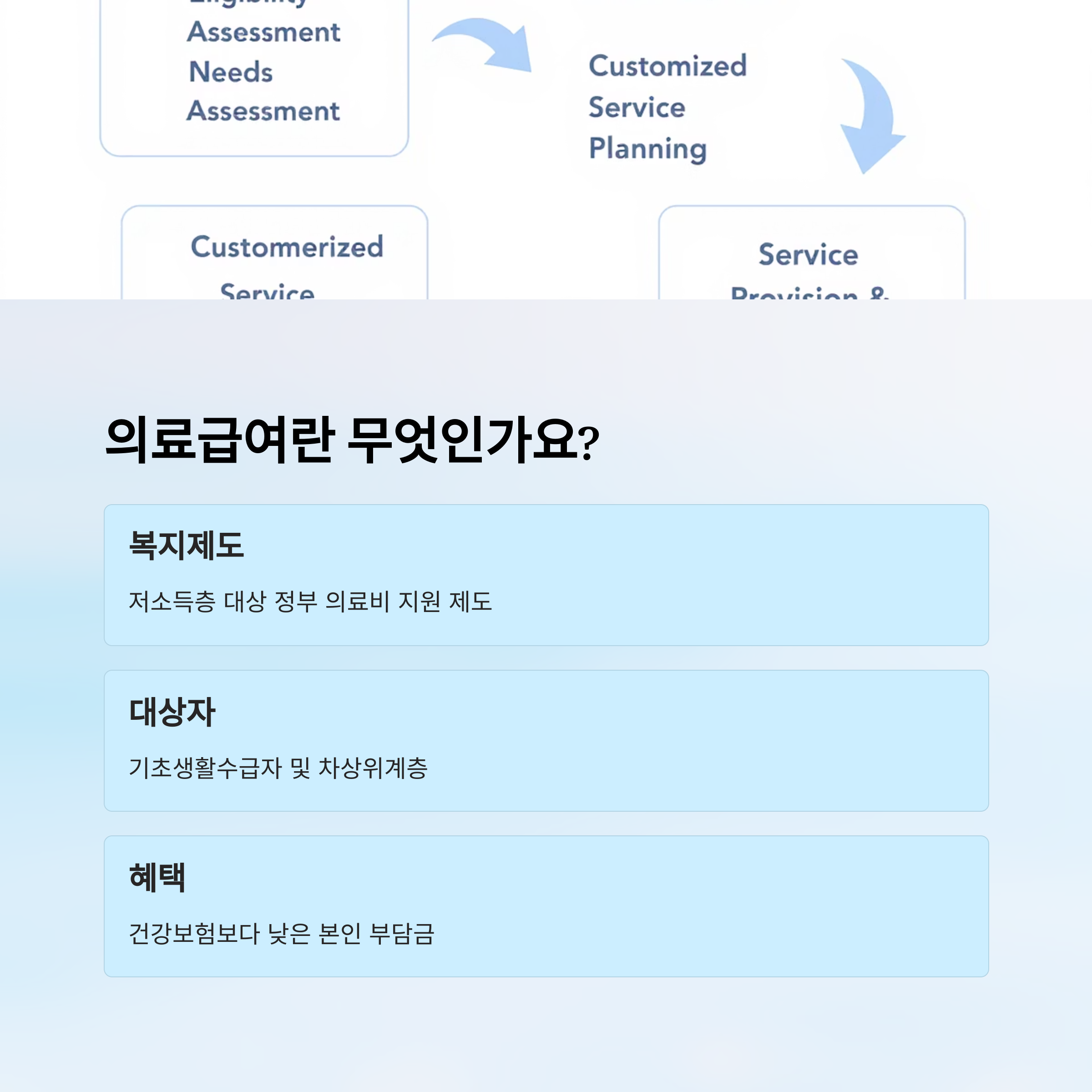 의료급여는 **국민건강보험 적용이 어려운 저소득층을 대상으로 정부가 의료비를 지원하는 복지제도**예요. 국민건강보험과는 다르게 **의료급여법에 의해 운영되며, 대상자의 경제적 상황에 따라 지원 범위가 결정돼요.**