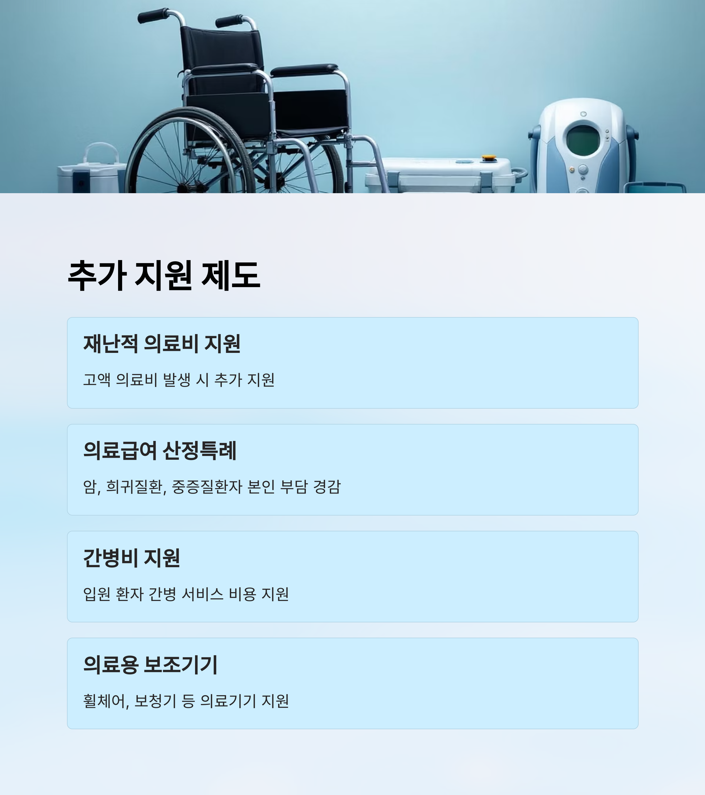| 의료용 보조기기 지원 | 휠체어, 보청기 등 의료기기 지원 |