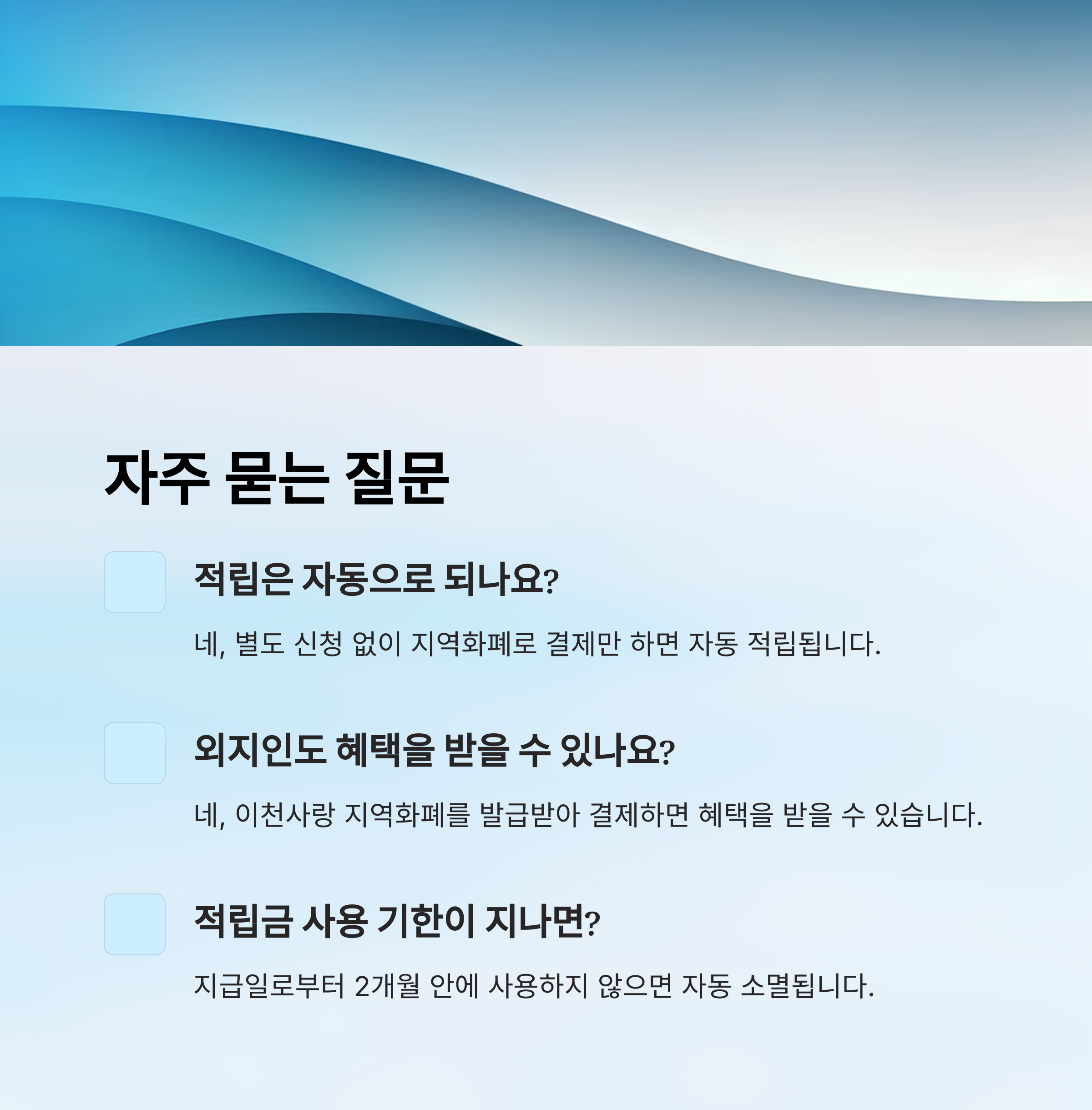 적립된 포인트는 이천시 가맹점에서 자유롭게 사용할 수 있지만, 지급일로부터 2개월 안에 써야 해요. 기간 지나면 소멸된다는 점 꼭 기억해요!