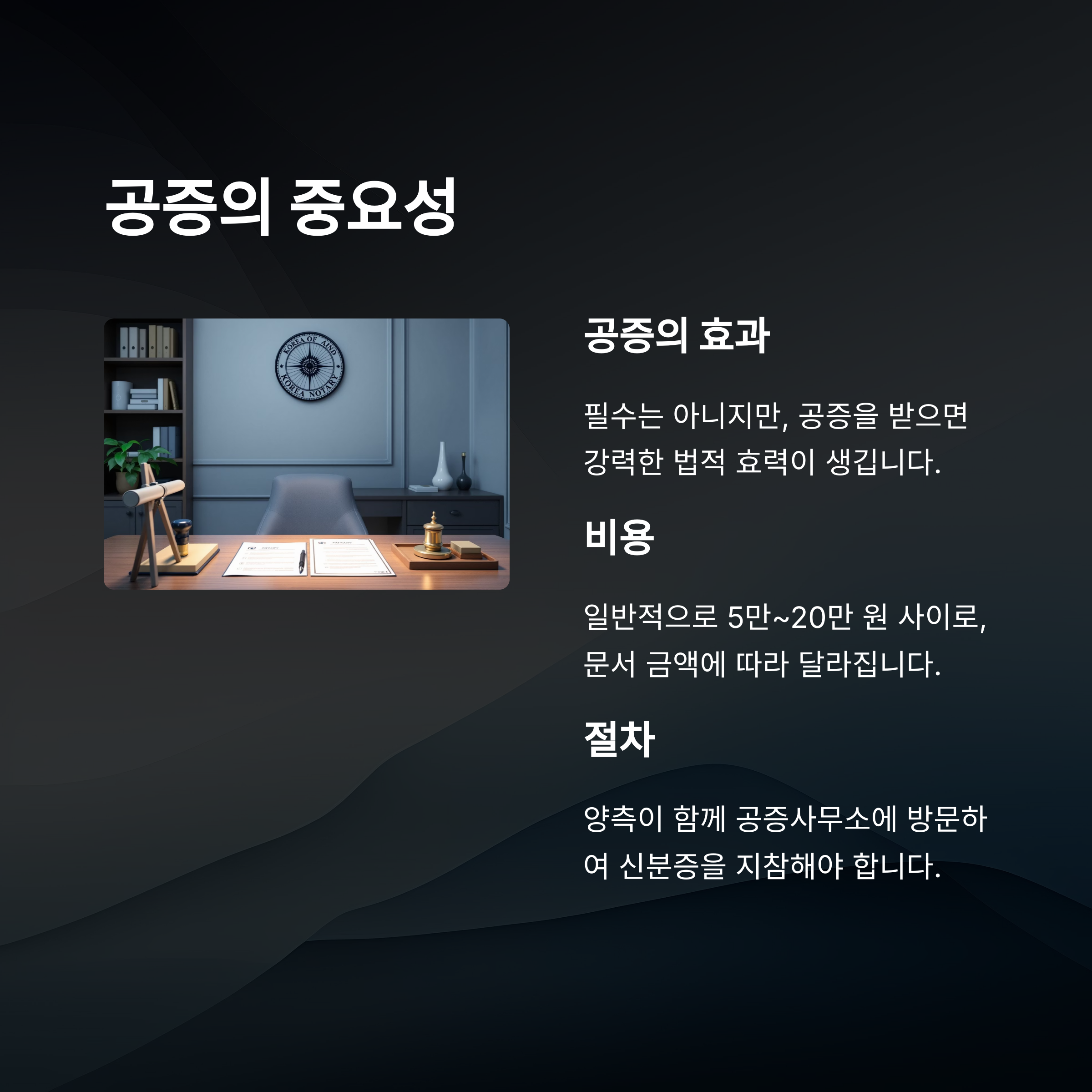 공증 비용은 보통 문서의 금액 기준으로 산정되며, 보통 5만~20만 원 사이예요. 다소 비용이 들긴 하지만, 장기적인 법적 분쟁을 방지하기 위한 보험 같은 역할이니 추천드려요.