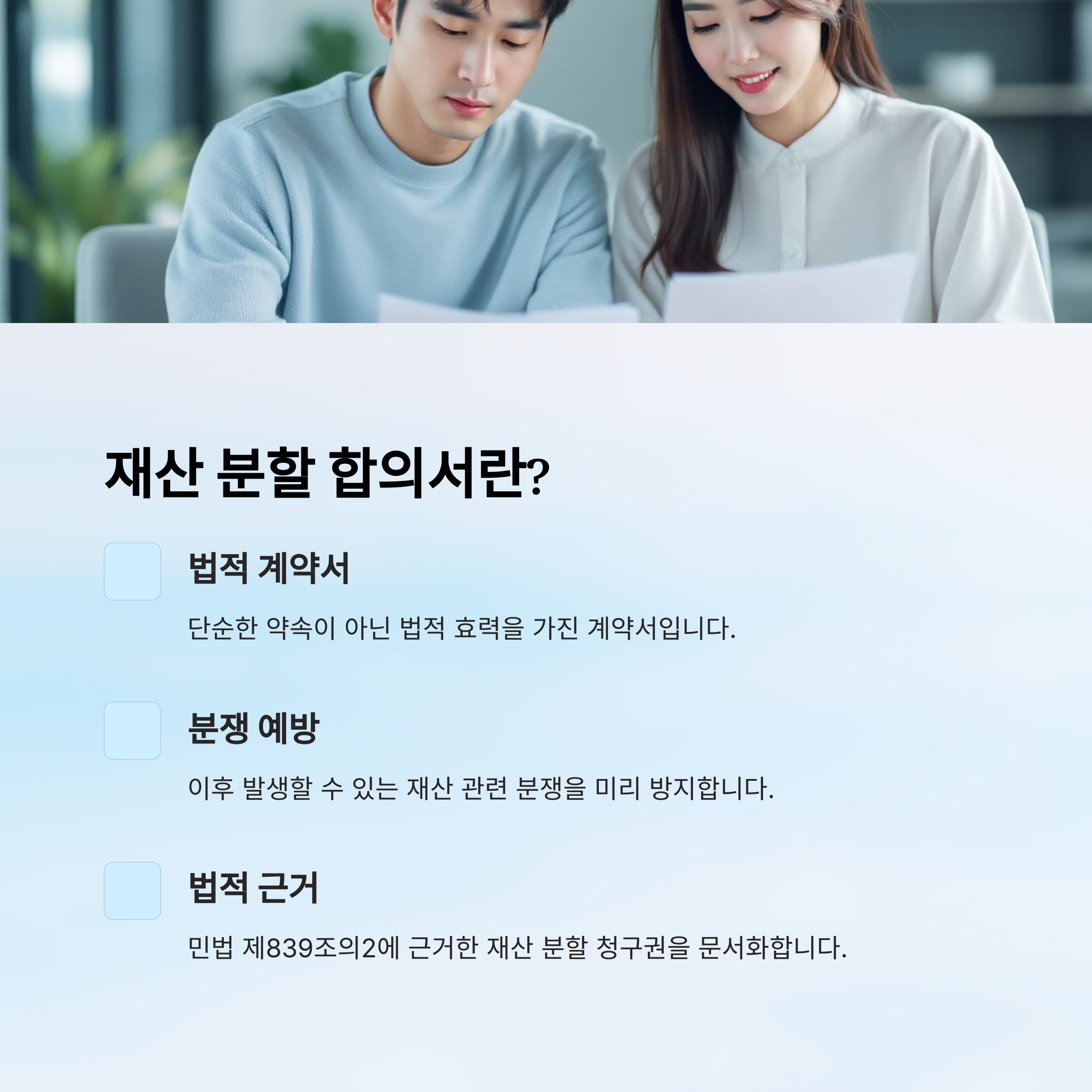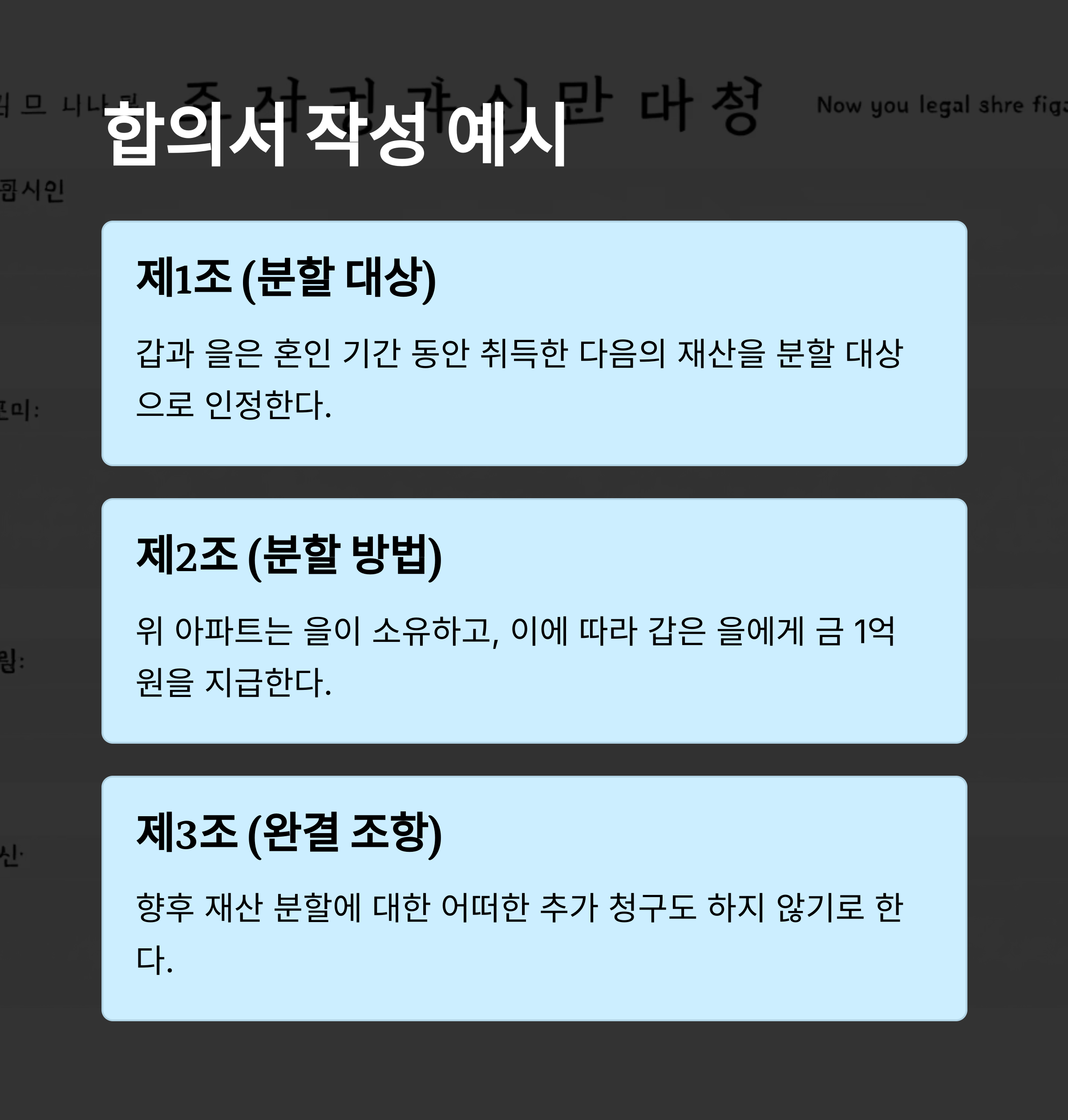 법적으로는 민법 제839조의2에 근거하여 재산 분할 청구권이 인정되고, 그 내용을 양측이 자발적으로 합의해 문서화한 것이 바로 이 ‘합의서’예요. 법원 판결 없이도 효력이 생길 수 있고, 경우에 따라 강제집행도 가능해요.