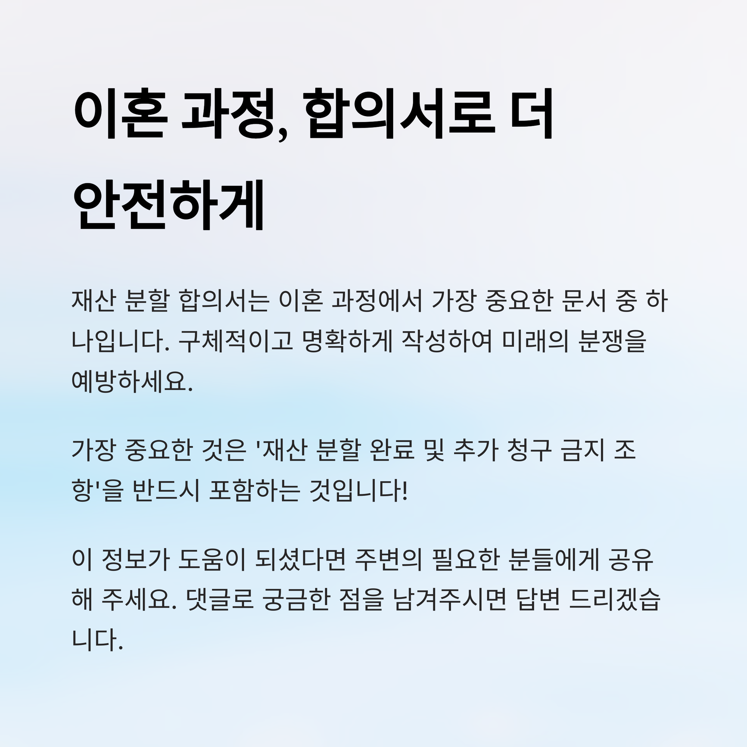 | 재산 분할 완료 조항 | 추후 청구 불가 명시 필수 |