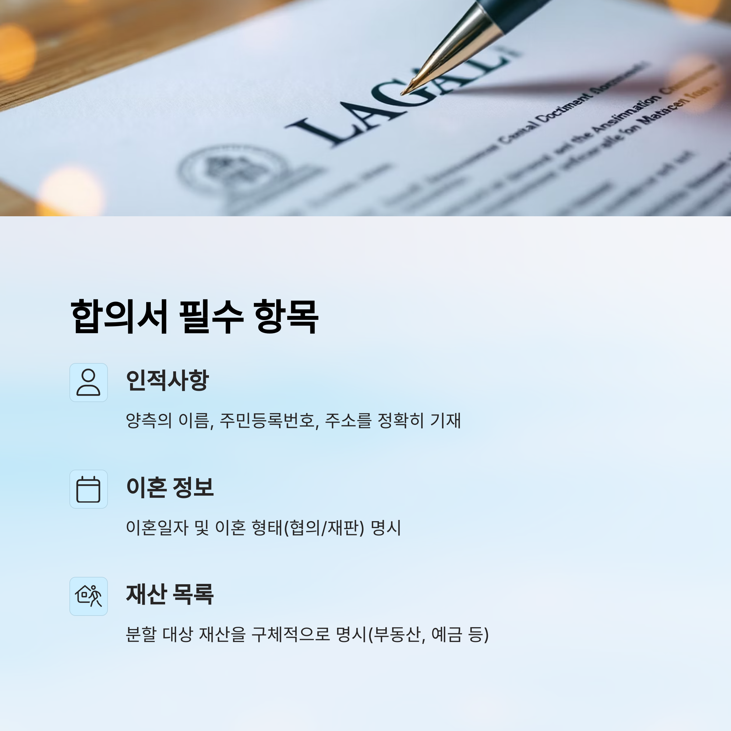 합의서는 재산 분할에 대한 권리와 책임을 명확히 해주는 공식 문서예요. 협의 이혼이든 재판 이혼이든 간에, 이 문서 하나로 나중에 생길 수 있는 분쟁을 미리 막을 수 있어서 정말 중요하죠.