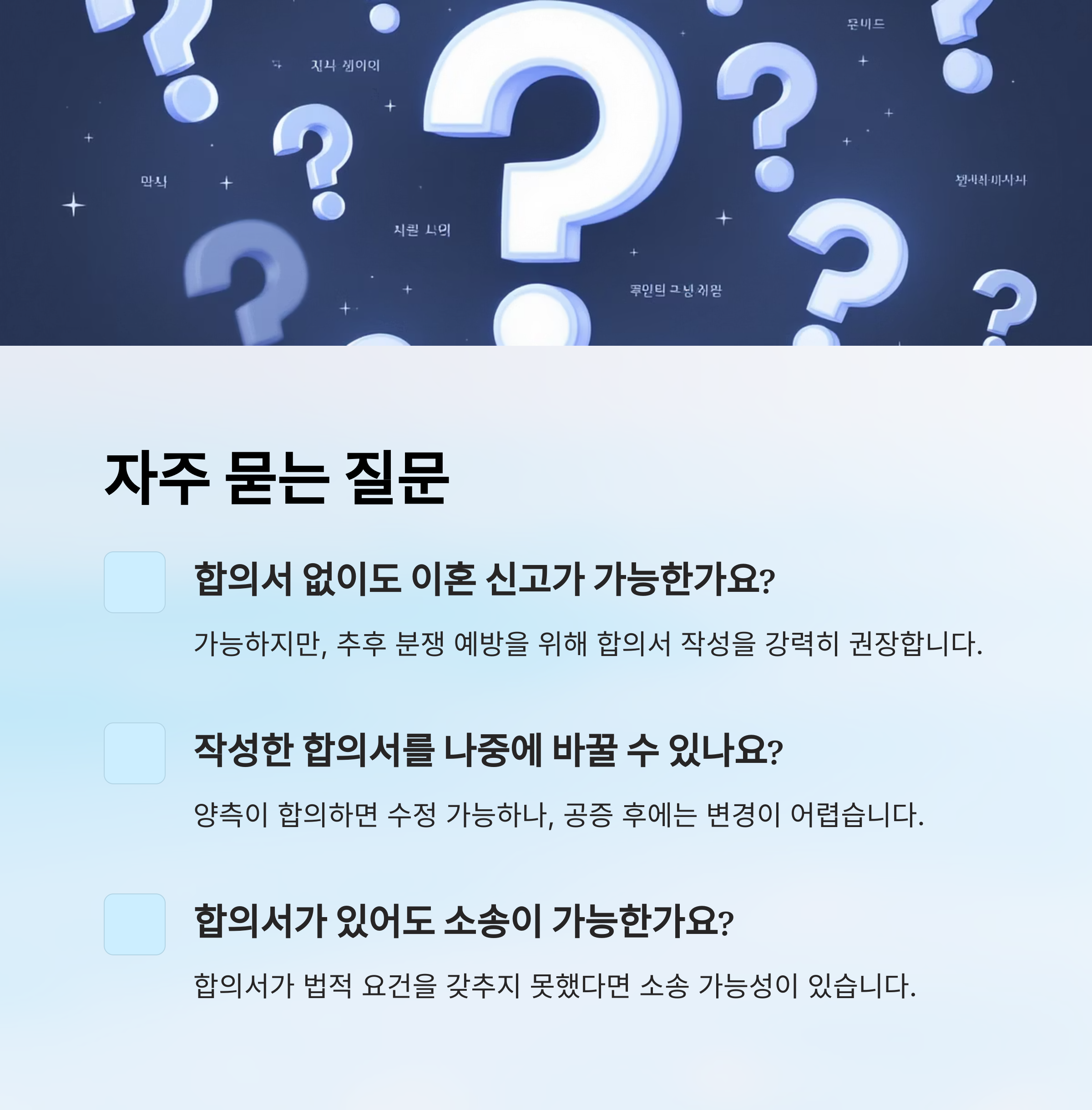 따라서 합의서는 감정적인 상태에서 서두르기보단, 충분히 숙고하고 전문가 조언을 받으면서 작성하는 게 좋아요. 공증을 함께 진행하면 무효 가능성도 줄어들어요.