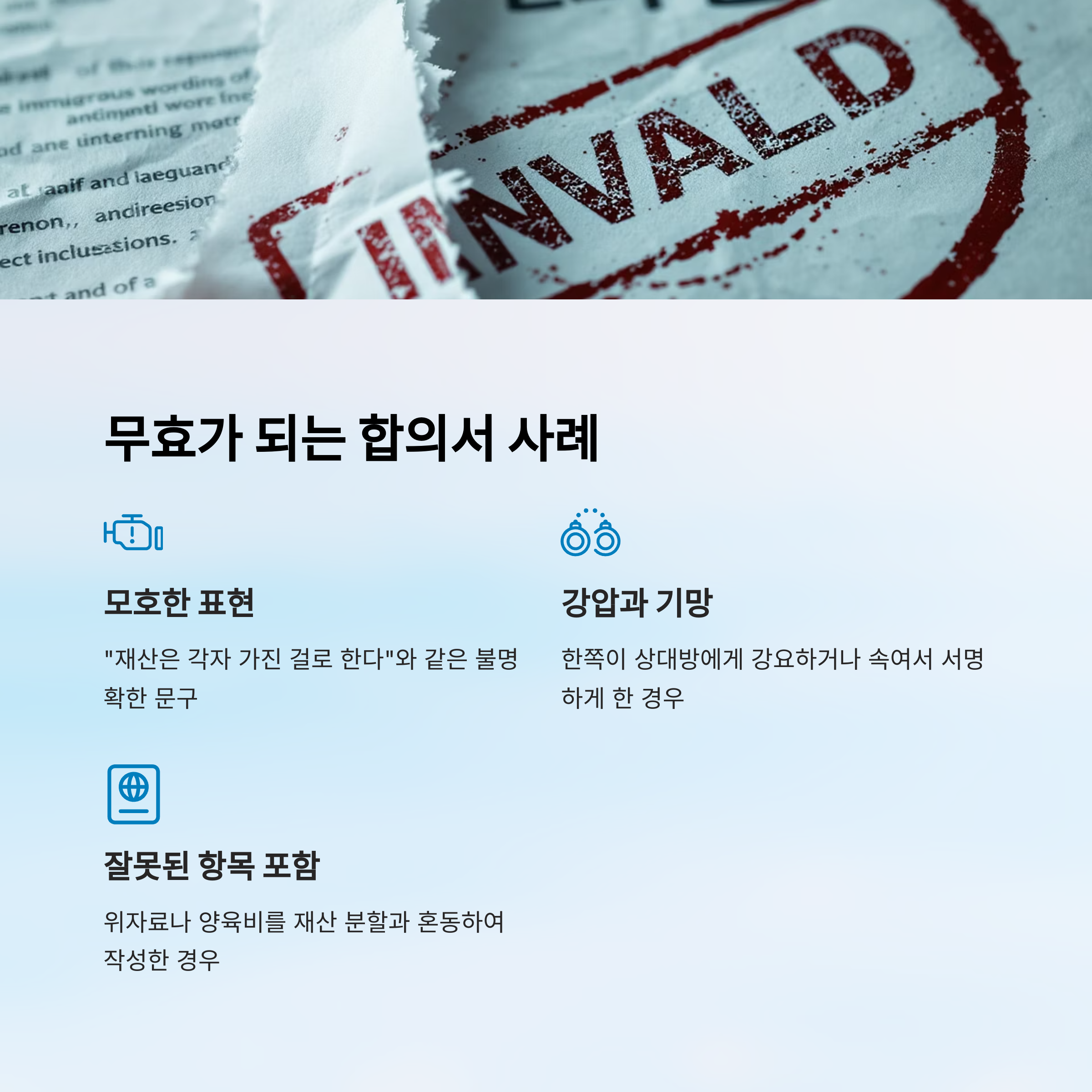 재산 분할 합의서가 있다고 해서 항상 법적 효력이 발생하는 건 아니에요. 형식적 요건이 빠지거나 강압, 기망 등의 문제가 있으면 무효로 판단될 수 있어요. 아래와 같은 경우엔 조심해야 해요.