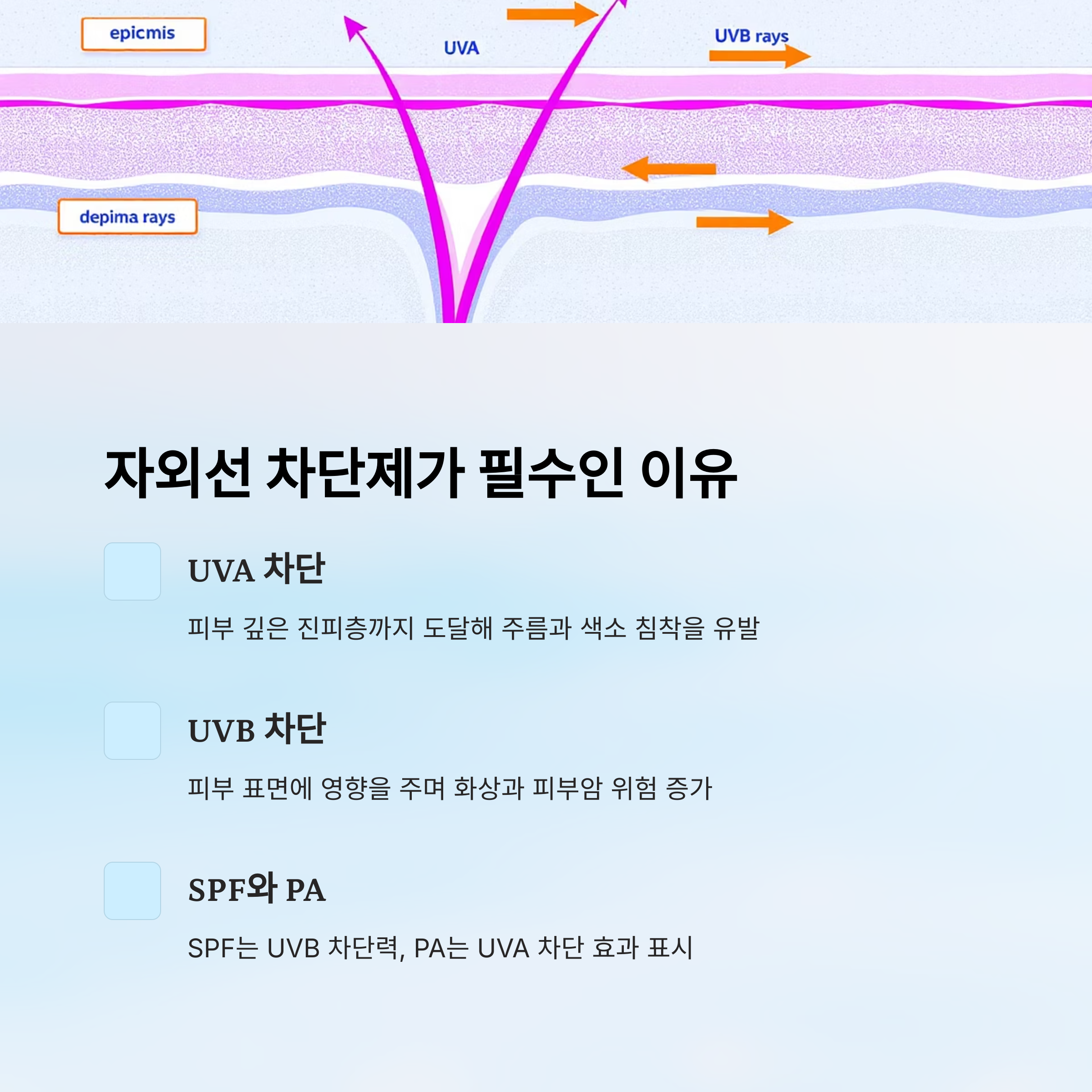 | UVB | 홍반, 피부암 | SPF 15~50+ |