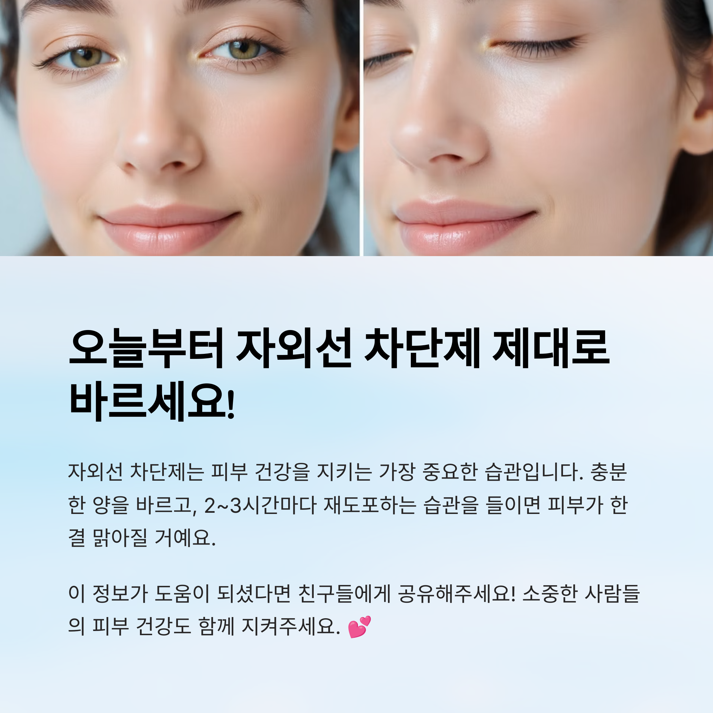 자외선 차단제를 아침에 한 번 바르고 하루 종일 안 바르는 건 거의 안 바른 것과 같다고 느껴져요. 재도포가 습관이 되면 피부도 훨씬 건강하게 유지할 수 있어요 🌞