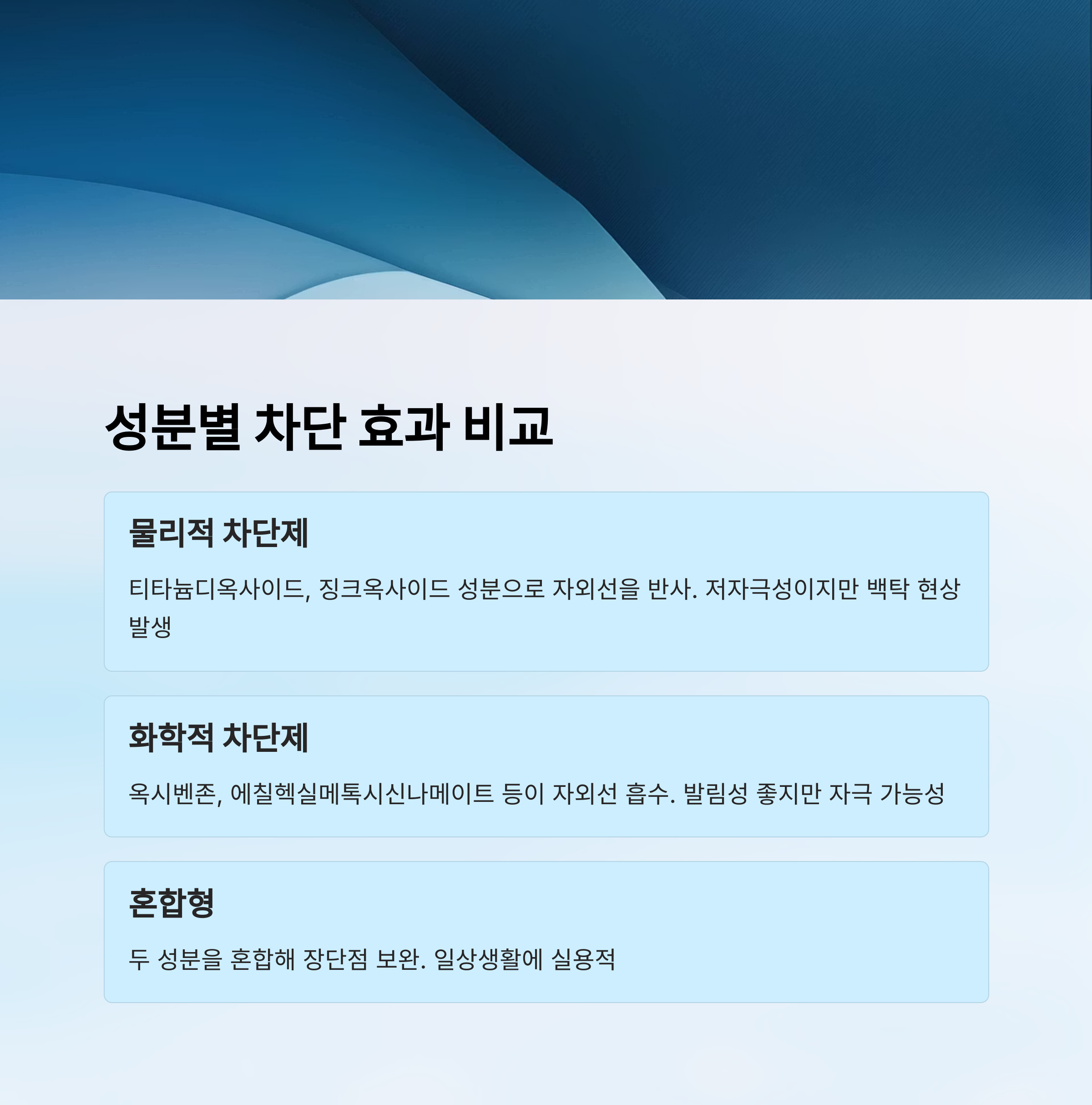 | 물리적 차단제 | 징크옥사이드, 티타늄디옥사이드 | 저자극, 광범위 차단 | 백탁, 끈적임 |