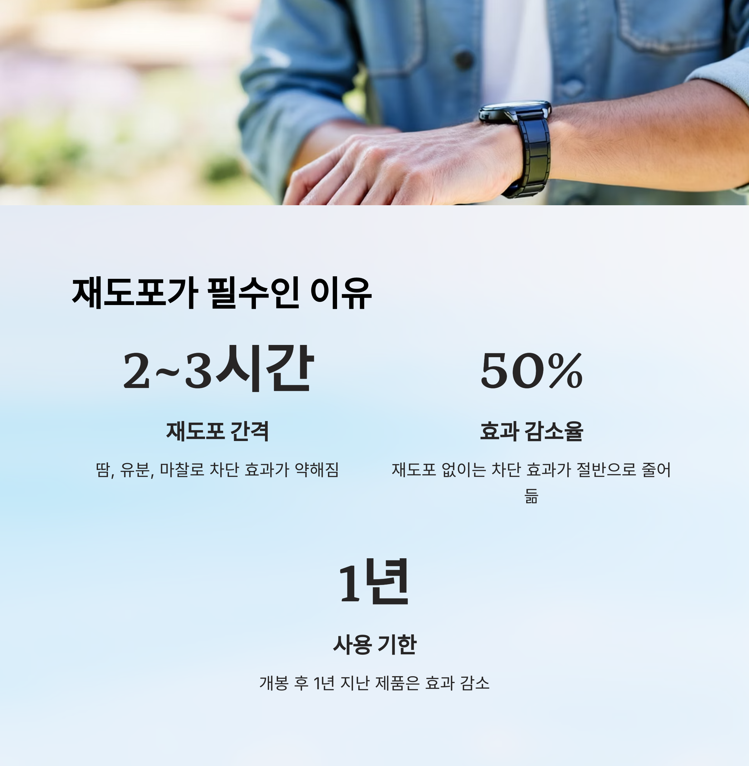 | 재도포 안 함 | 보호막 약화 | 2~3시간마다 덧바름 |