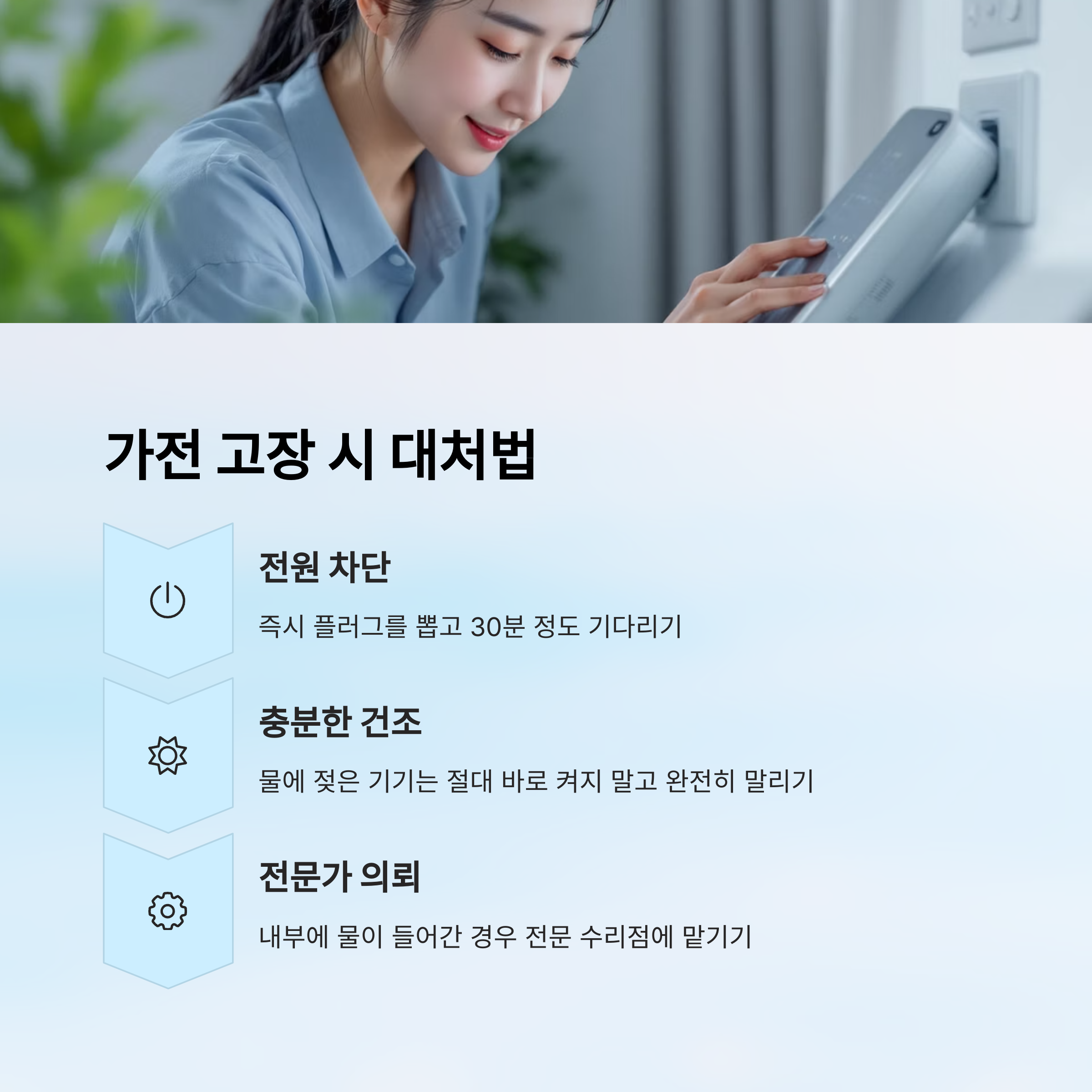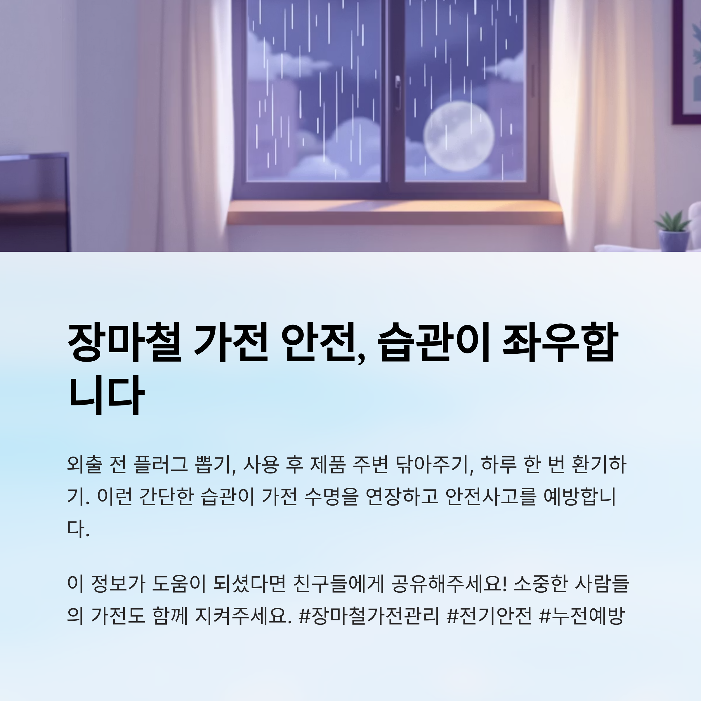 예방은 항상 '습관'에서 시작돼요. 외출 전 플러그 뽑기, 사용 후 제품 주변 수건으로 닦아주기, 그리고 하루 한 번 환기하기. 이런 간단한 행동이 장마철 고장을 줄이는 가장 현실적인 방법이에요.