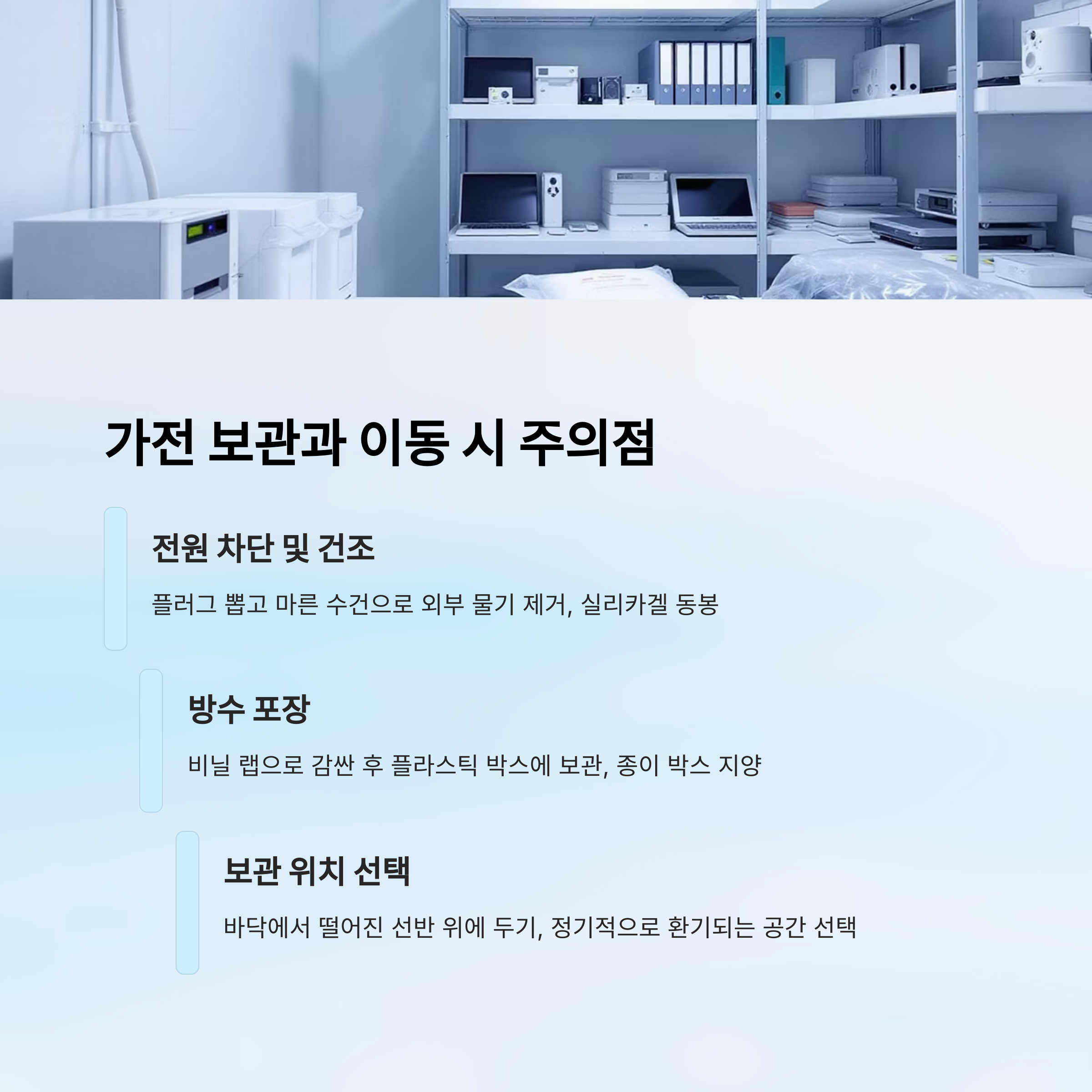 보관 장소는 바닥에서 떨어진 선반 위에 두는 것이 좋아요. 습기와 곰팡이는 바닥에 먼저 생기기 때문에 가전이 직접 닿지 않게 해주는 게 핵심이에요. 또 정기적으로 환기되는 공간이면 더 좋고요.