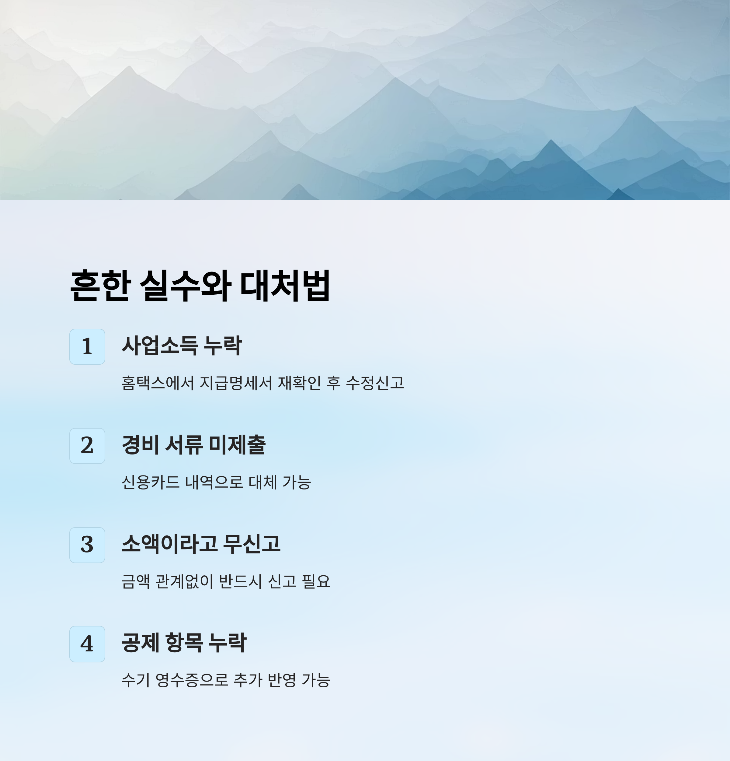 | 사업소득 누락 | 지급명세서를 놓침 | 홈택스에서 재확인 후 수정신고 |