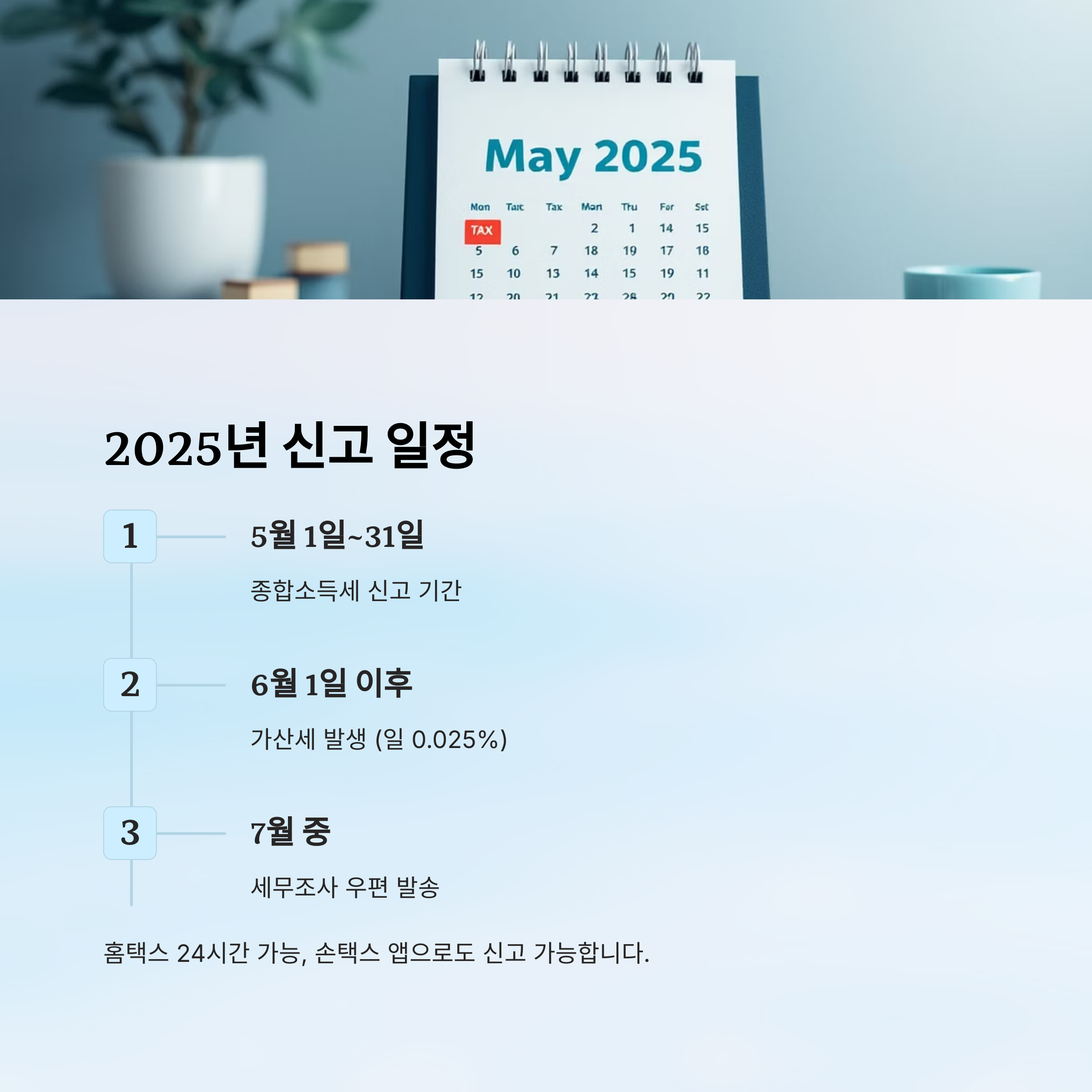2025년 종합소득세 신고는 예년과 마찬가지로 5월 한 달 동안 진행돼요. 정확히는 2025년 5월 1일부터 5월 31일까지예요. 이 기간 내에 반드시 신고 및 납부를 완료해야 불이익 없이 마무리할 수 있어요. 😊