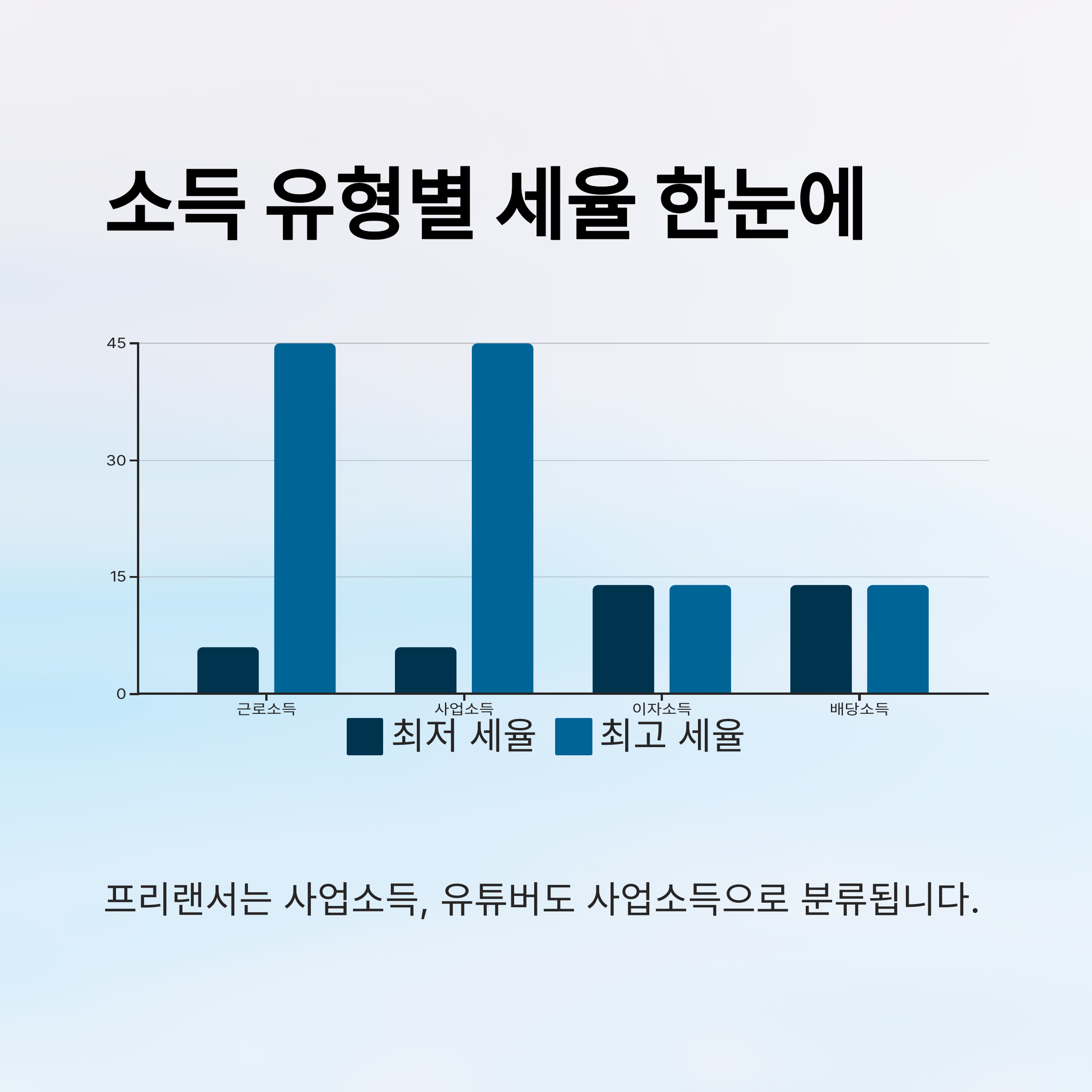 | 사업소득 | 자영업이나 프리랜서 활동 소득 | 디자이너, 유튜버 | 6%~45% |