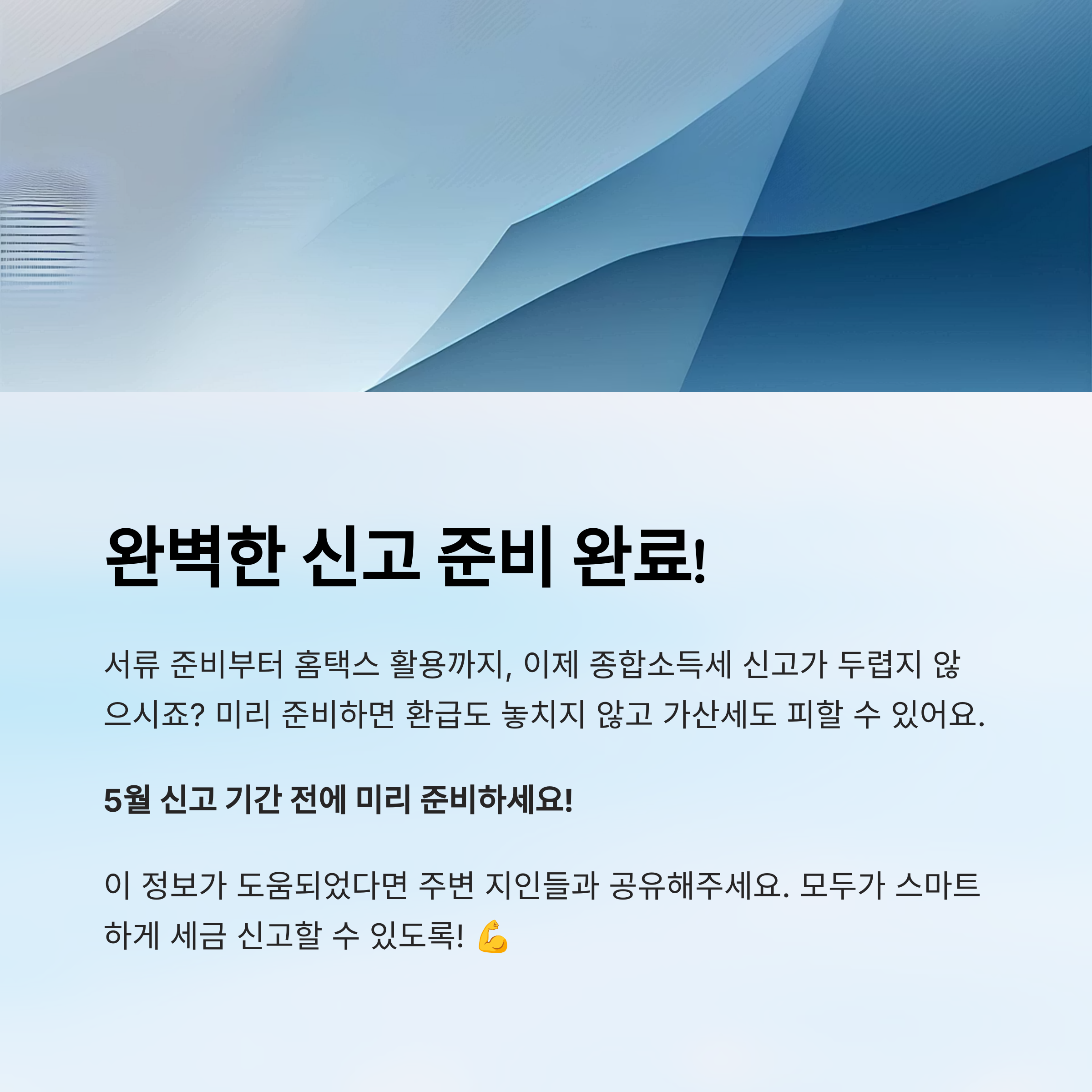 신고기한을 지키는 건 기본 중의 기본이에요. 아무리 서류를 잘 준비해도 제출이 늦어지면 의미가 없으니까요. 특히 신고 마지막 주는 접속이 몰려서 홈택스도 느려질 수 있으니 여유 있게 미리 처리하는 걸 추천해요. 😉
