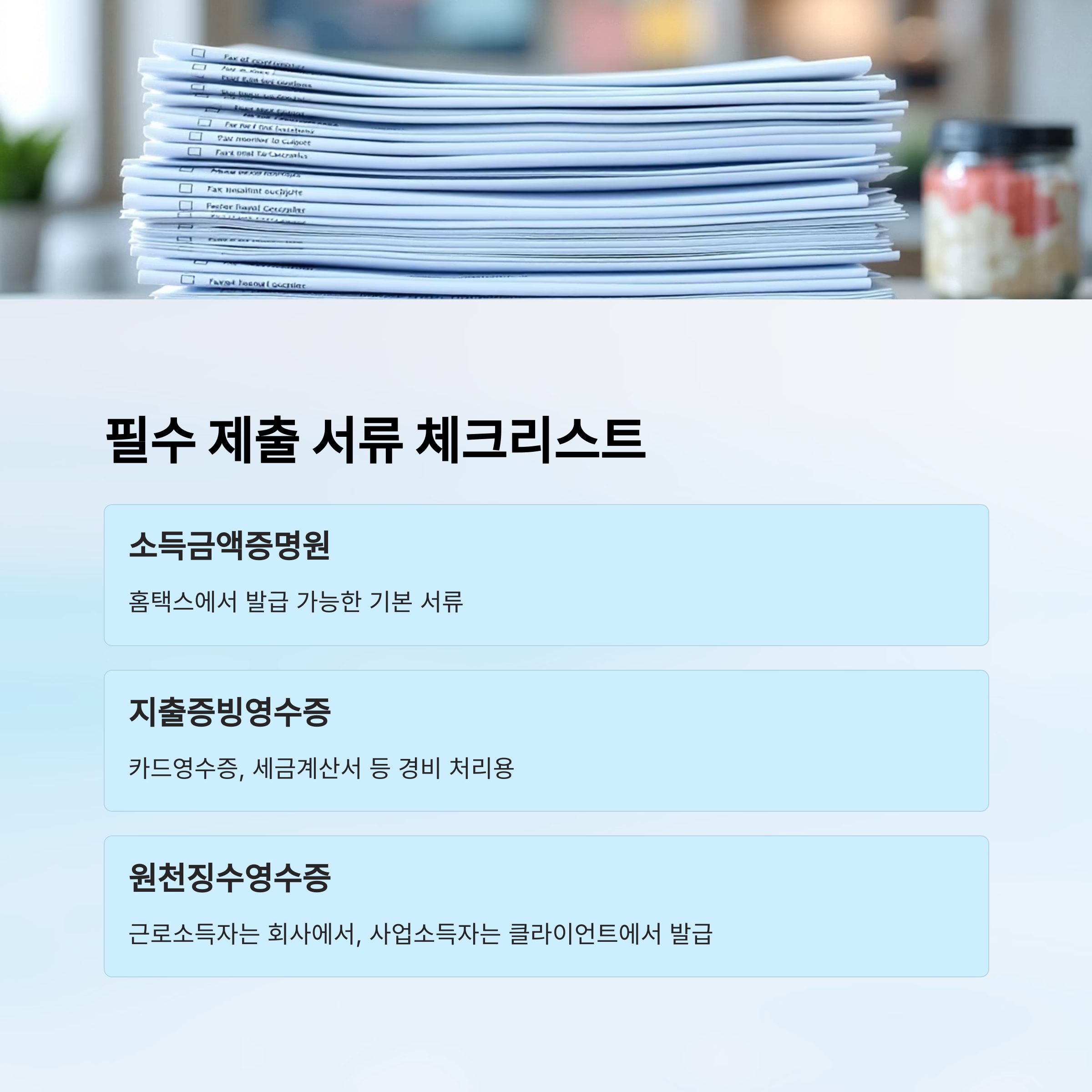 | 프리랜서 | 사업소득 원천징수영수증, 지출증빙 | 홈택스 또는 클라이언트에게 요청 |