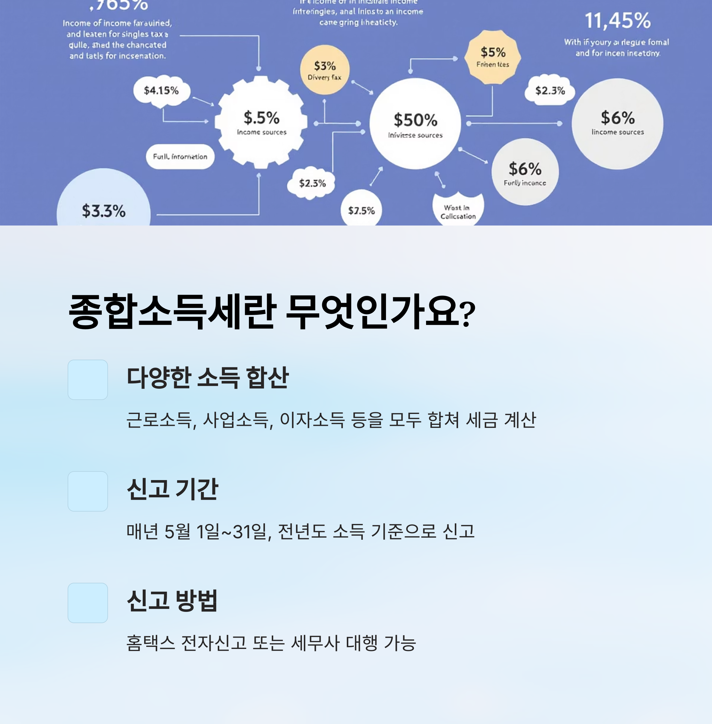 종합소득세는 개인이 한 해 동안 벌어들인 다양한 소득을 하나로 합산해 세금을 내는 제도예요. 근로소득, 사업소득, 이자소득, 배당소득 등 다양한 소득이 대상이 되는데, 이를 국세청에 정확히 신고하기 위해선 꼼꼼하게 서류를 준비하는 게 아주 중요하답니다.
