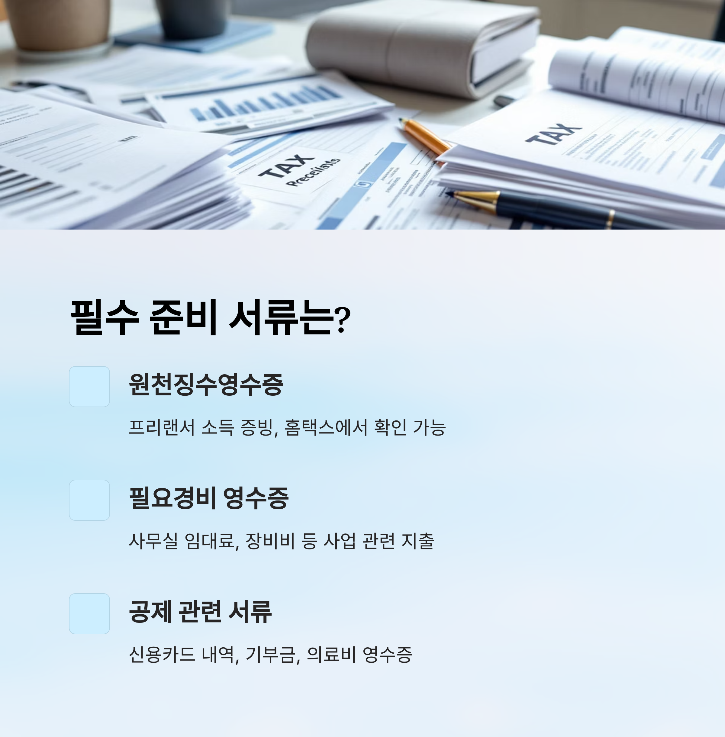 필요경비도 매우 중요한 항목이에요. 사무실 임대료, 교통비, 장비 구입비 등 사업과 관련된 지출은 모두 증빙자료를 챙겨야 공제받을 수 있어요. 세금계산서, 카드내역, 현금영수증 등을 잘 보관해두면 도움이 돼요.