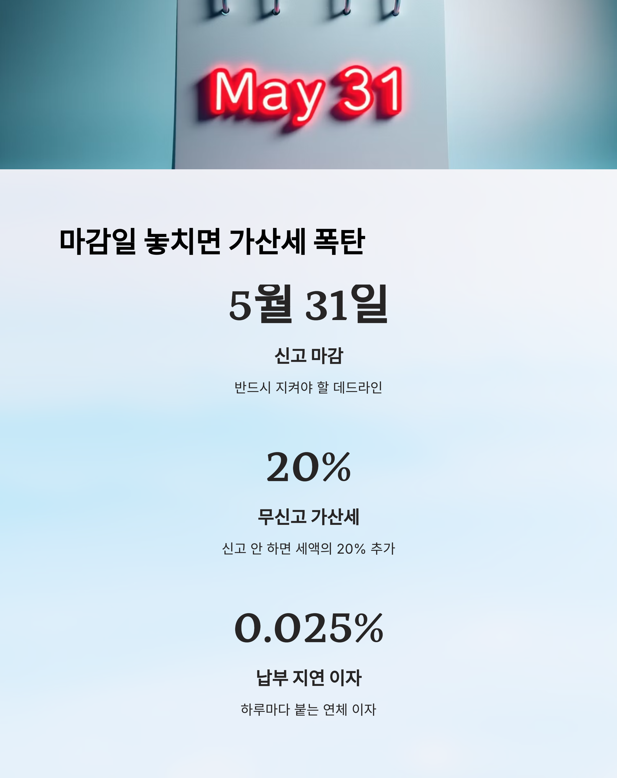 A4. 신고를 늦추면 무신고 가산세가 붙고, 납부도 늦으면 하루마다 이자가 붙어요. 반드시 5월 31일까지 완료하는 게 중요해요.
