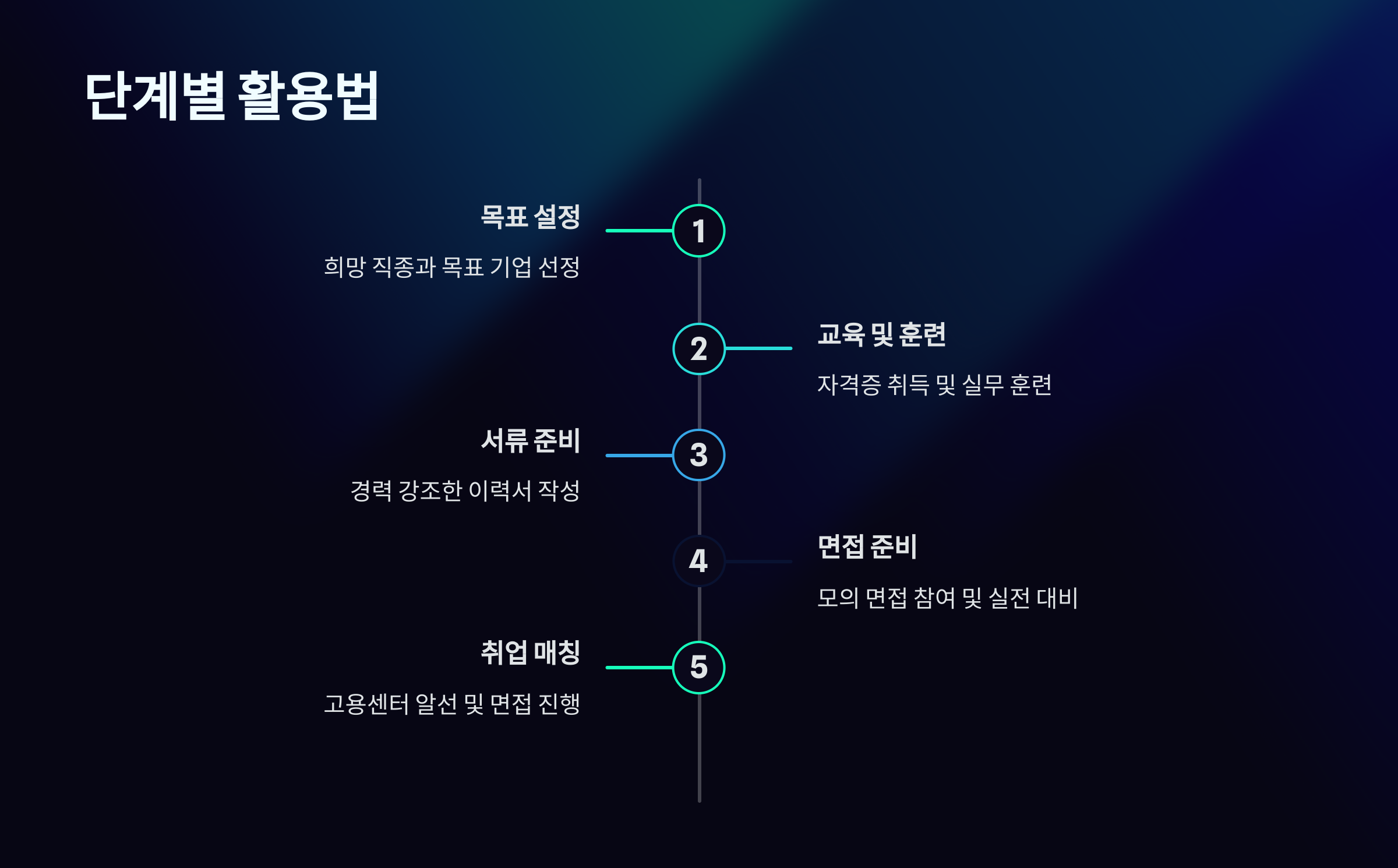 | 5. 일자리 매칭 및 취업 | 고용센터의 취업 알선 및 면접 진행 | 1개월 이내 |