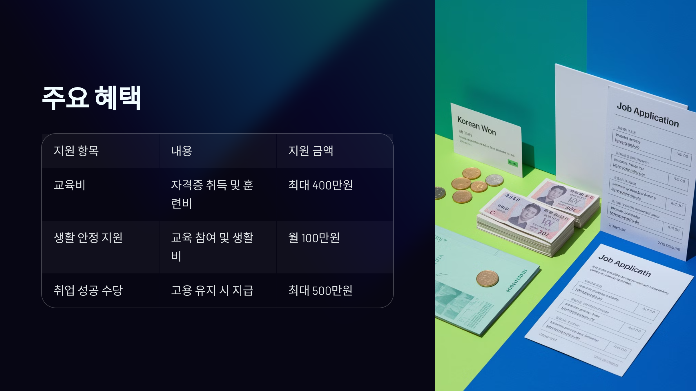 | 교육비 지원 | 자격증 취득 및 직업 훈련비 지원 | 최대 400만 원 |