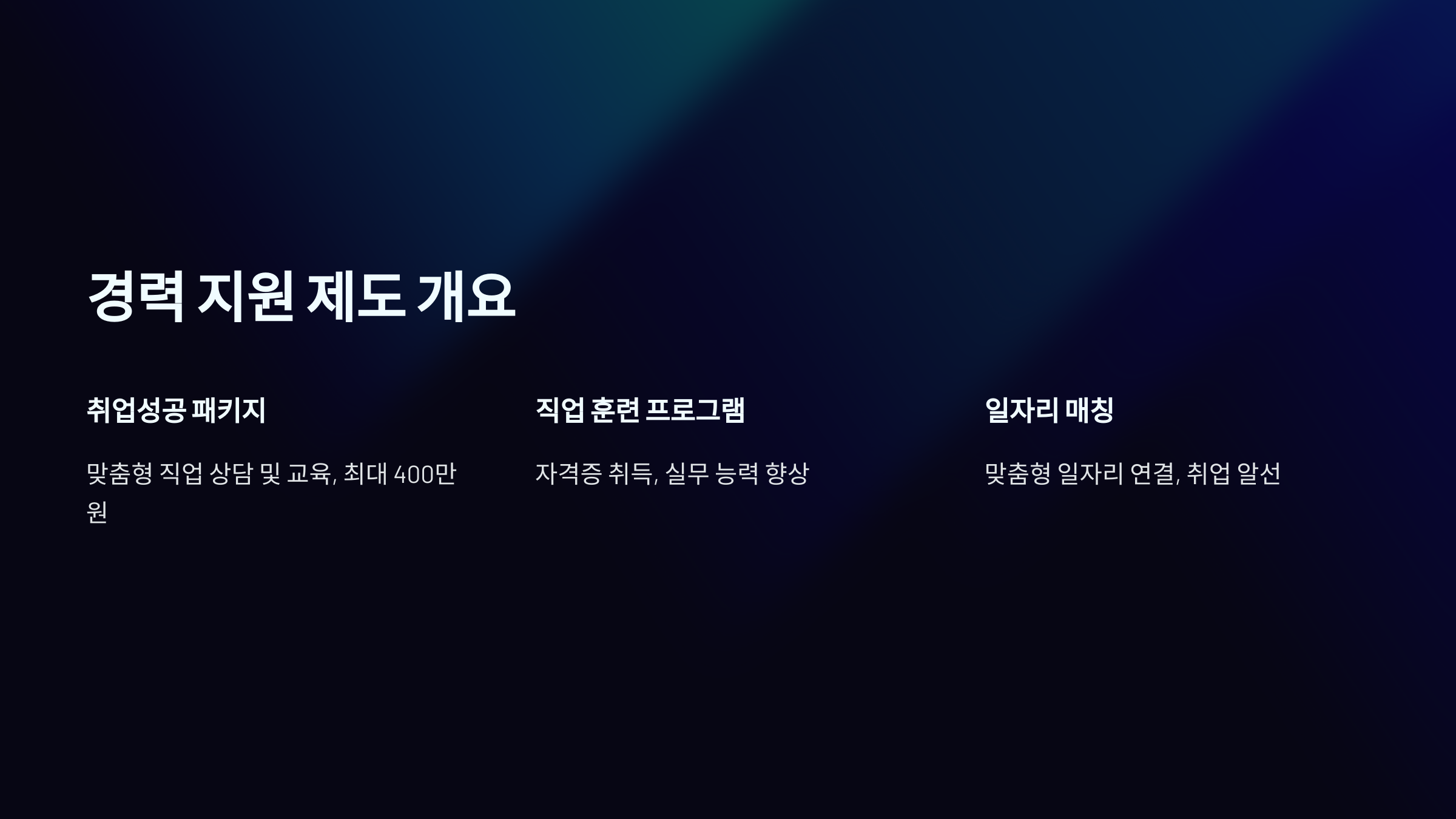 | 취업성공 패키지 | 맞춤형 직업 상담 및 직무 교육 제공 | 최대 400만 원 지원 |