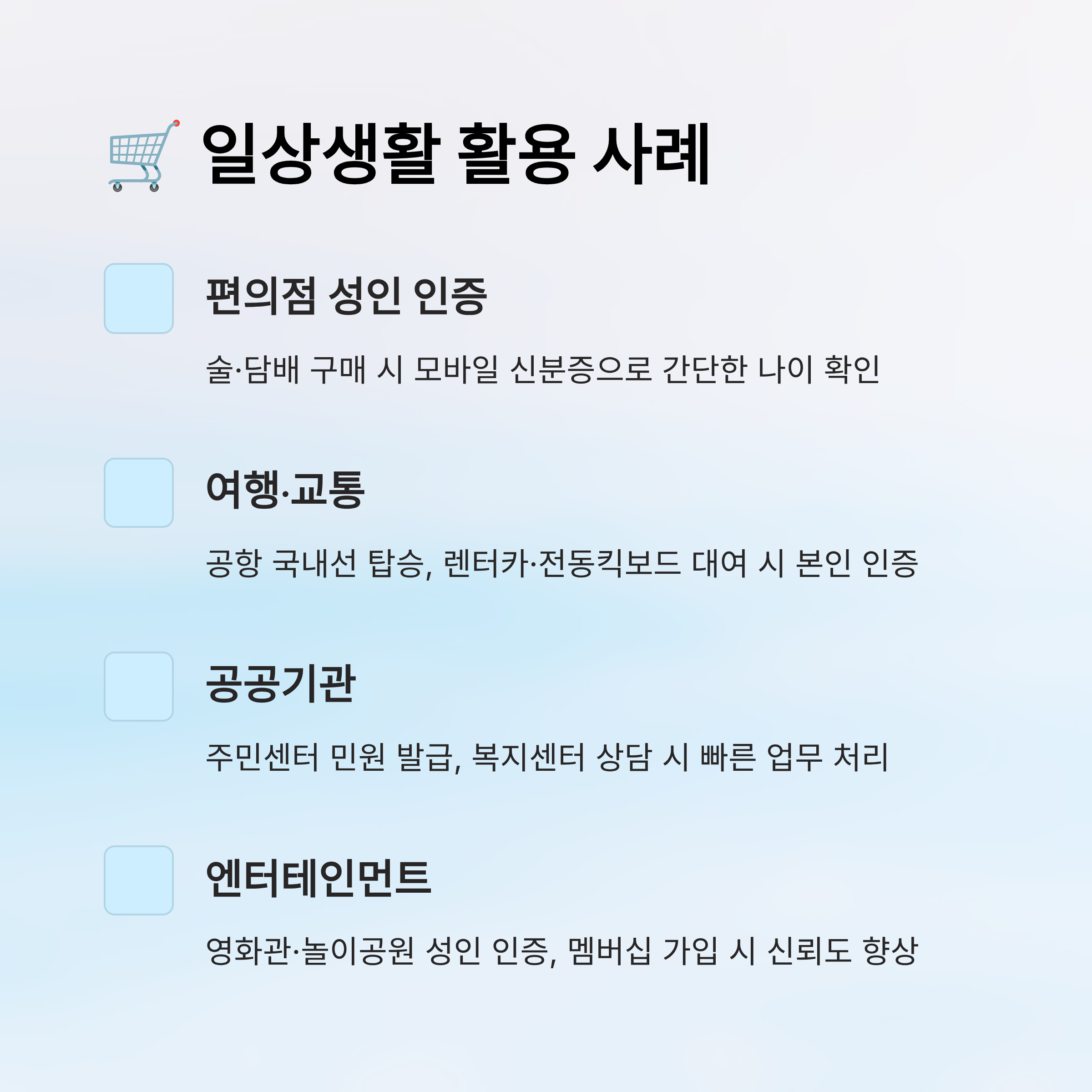 또한 무인 자판기나 무인 편의점 같은 곳에서도 활용돼요. 예전에는 실물 신분증을 기계에 직접 스캔해야 했지만, 이제는 QR코드나 화면 인증으로 성인 인증을 할 수 있어요. 덕분에 24시간 운영되는 무인 매장에서 훨씬 간편하게 이용할 수 있답니다.