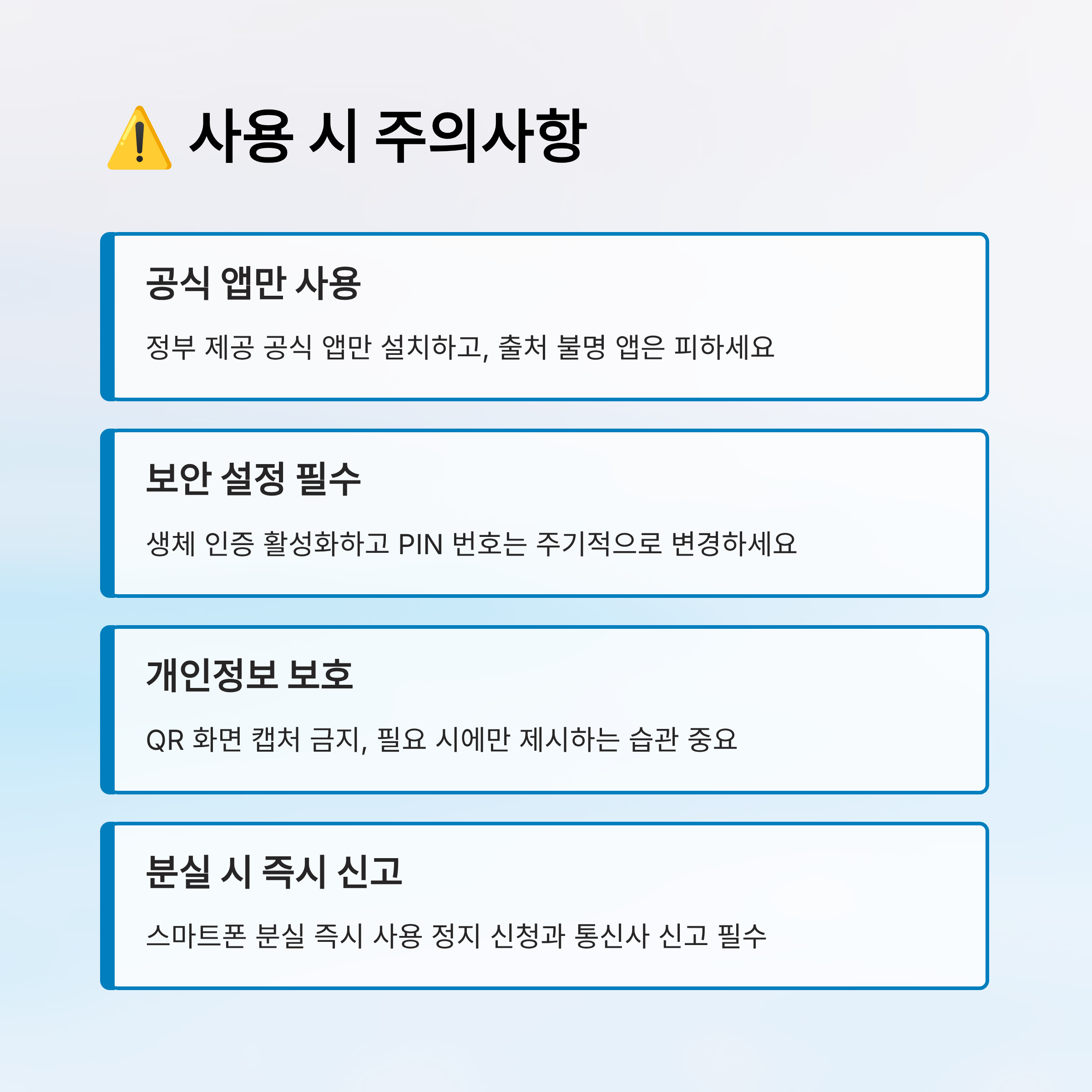 | 앱 사용 | 비공식 앱 설치 금지 | 정부 공식 앱 이용 |