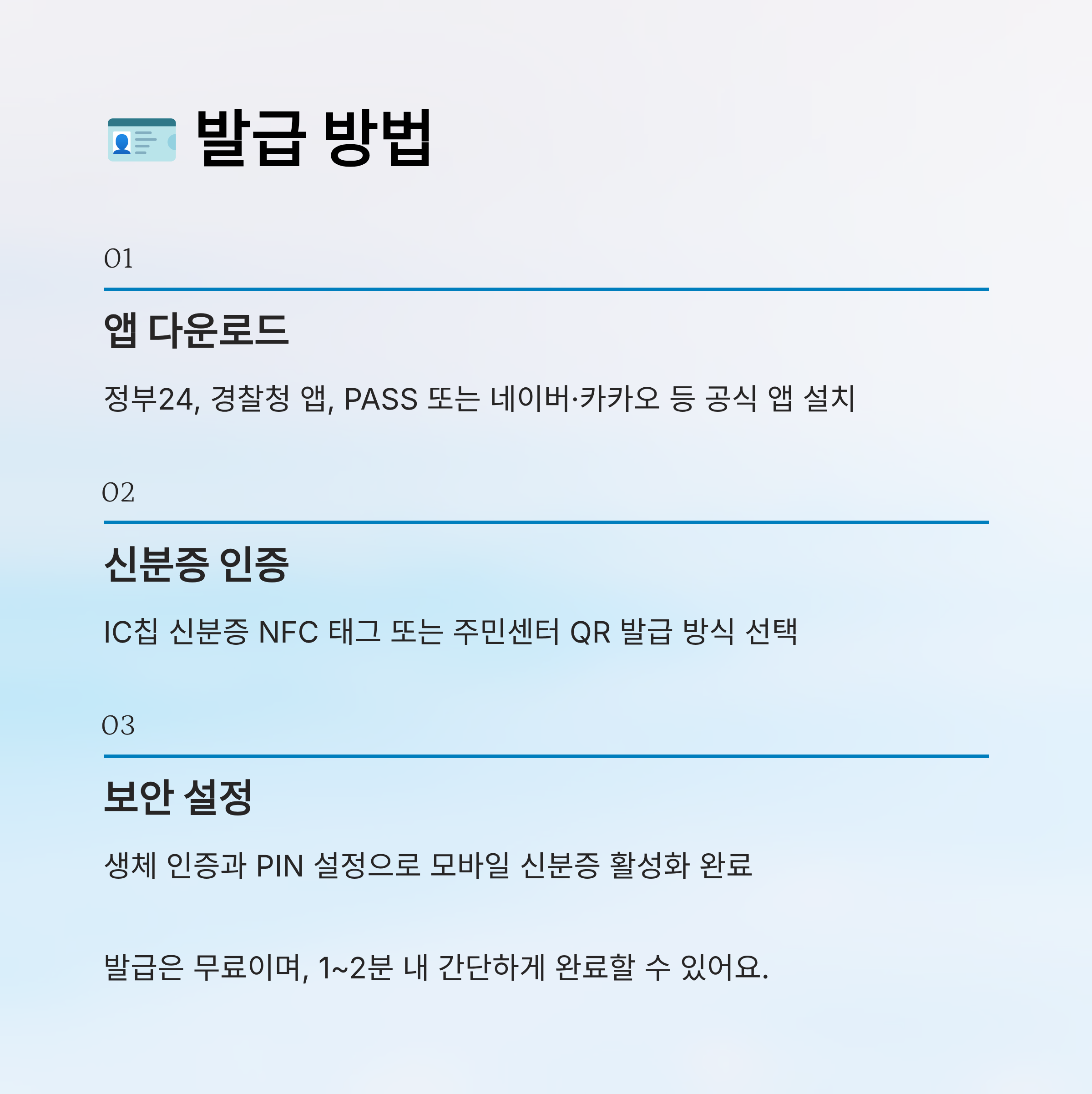발급 과정은 크게 세 단계로 나눌 수 있어요. 첫째, 정부 공식 앱(정부24, 경찰청 앱, 또는 PASS) 다운로드. 둘째, 실물 신분증 태그 혹은 QR 인증. 셋째, 생체 인증과 PIN 설정을 통해 모바일 신분증을 활성화해요. 이렇게 하면 바로 사용할 수 있답니다.