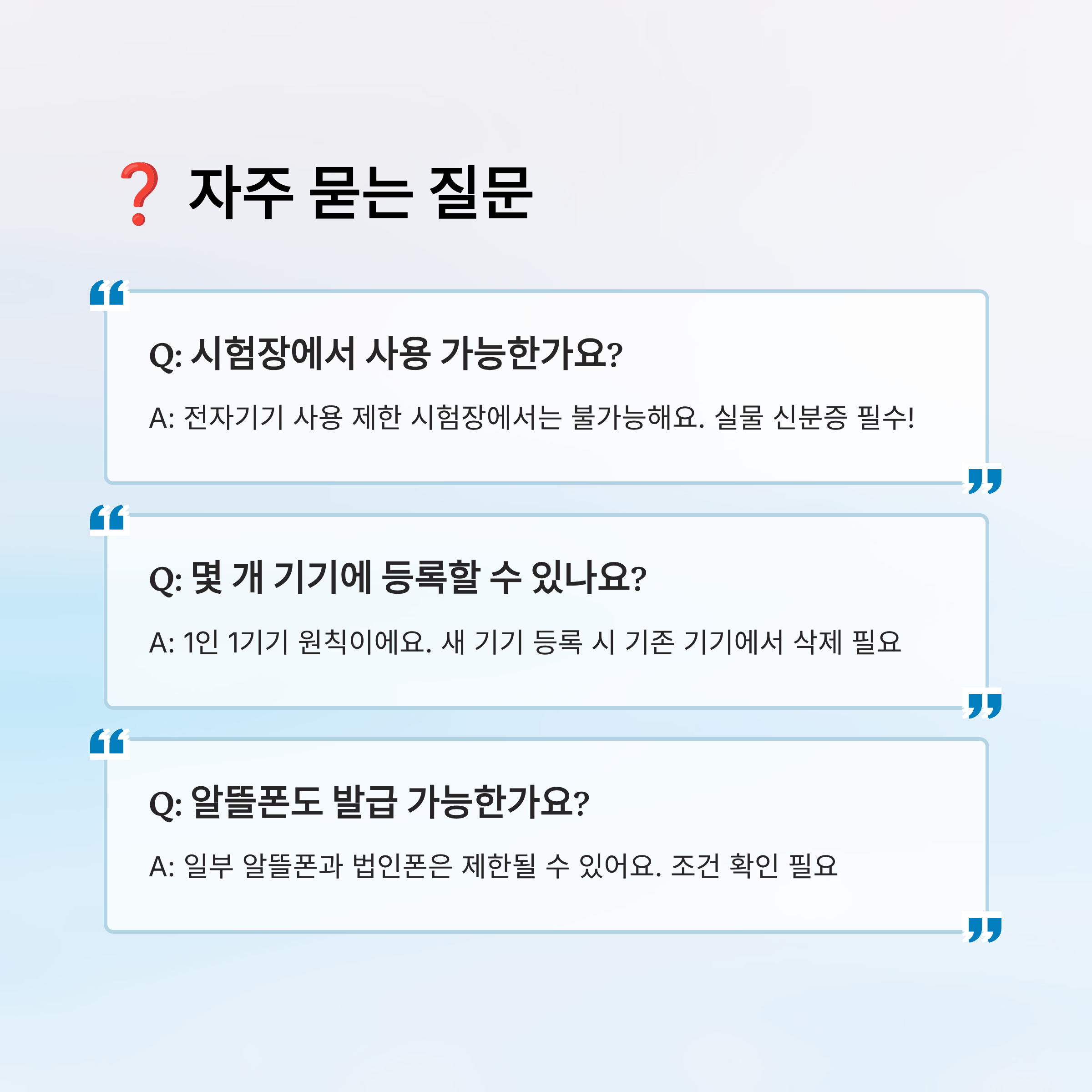 다만 일부 제한도 존재해요. 법인 명의 휴대폰이나 알뜰폰 일부 기기에서는 발급이 불가능할 수 있고, 시험장처럼 전자기기 사용이 통제되는 장소에서는 여전히 실물 신분증을 요구하는 경우가 있어요. 따라서 모든 상황을 100% 대체하진 못하니, 상황에 따라 보완적으로 활용하는 게 좋아요.