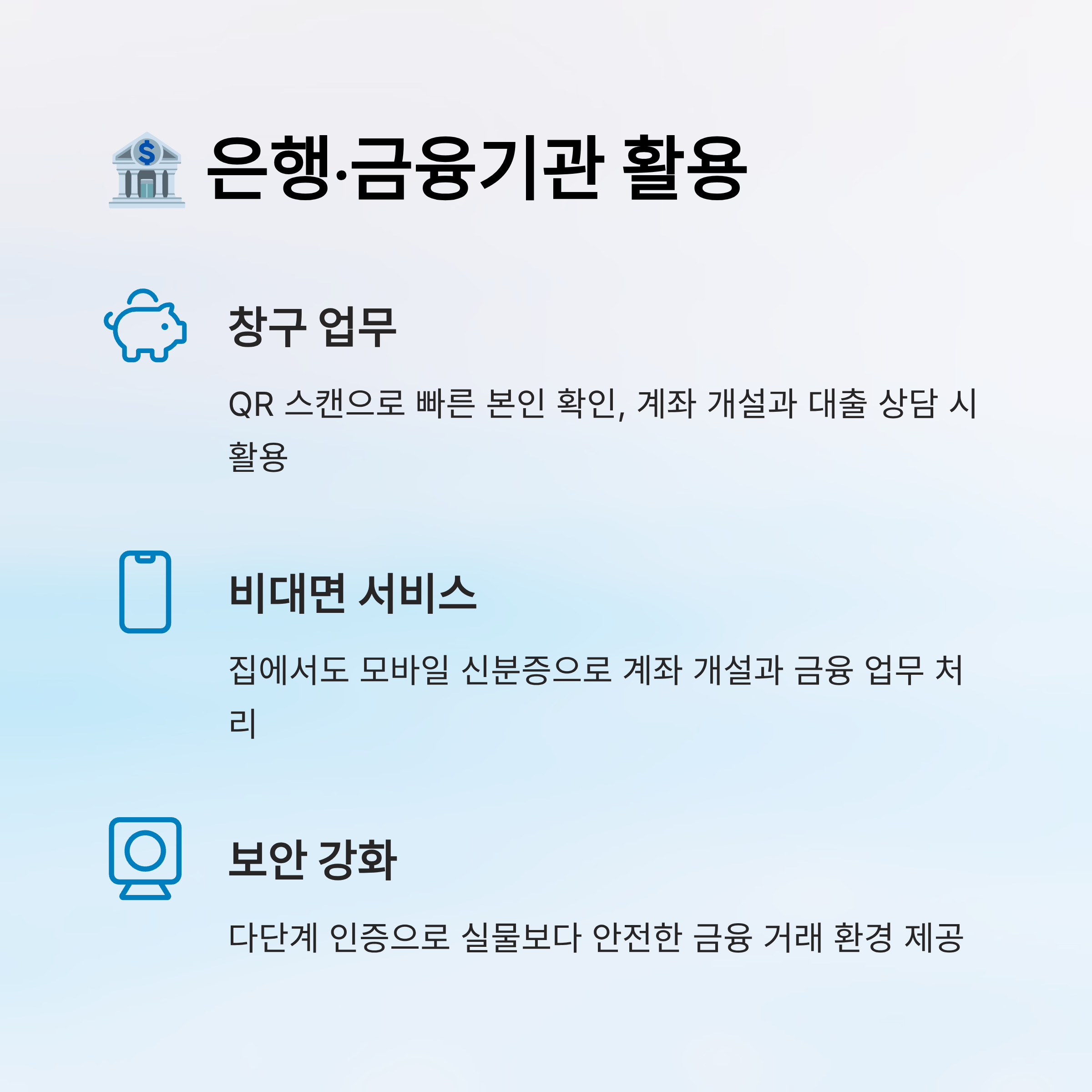 | 대출 상담 | 창구에서 모바일 확인 | 위조 방지 |
