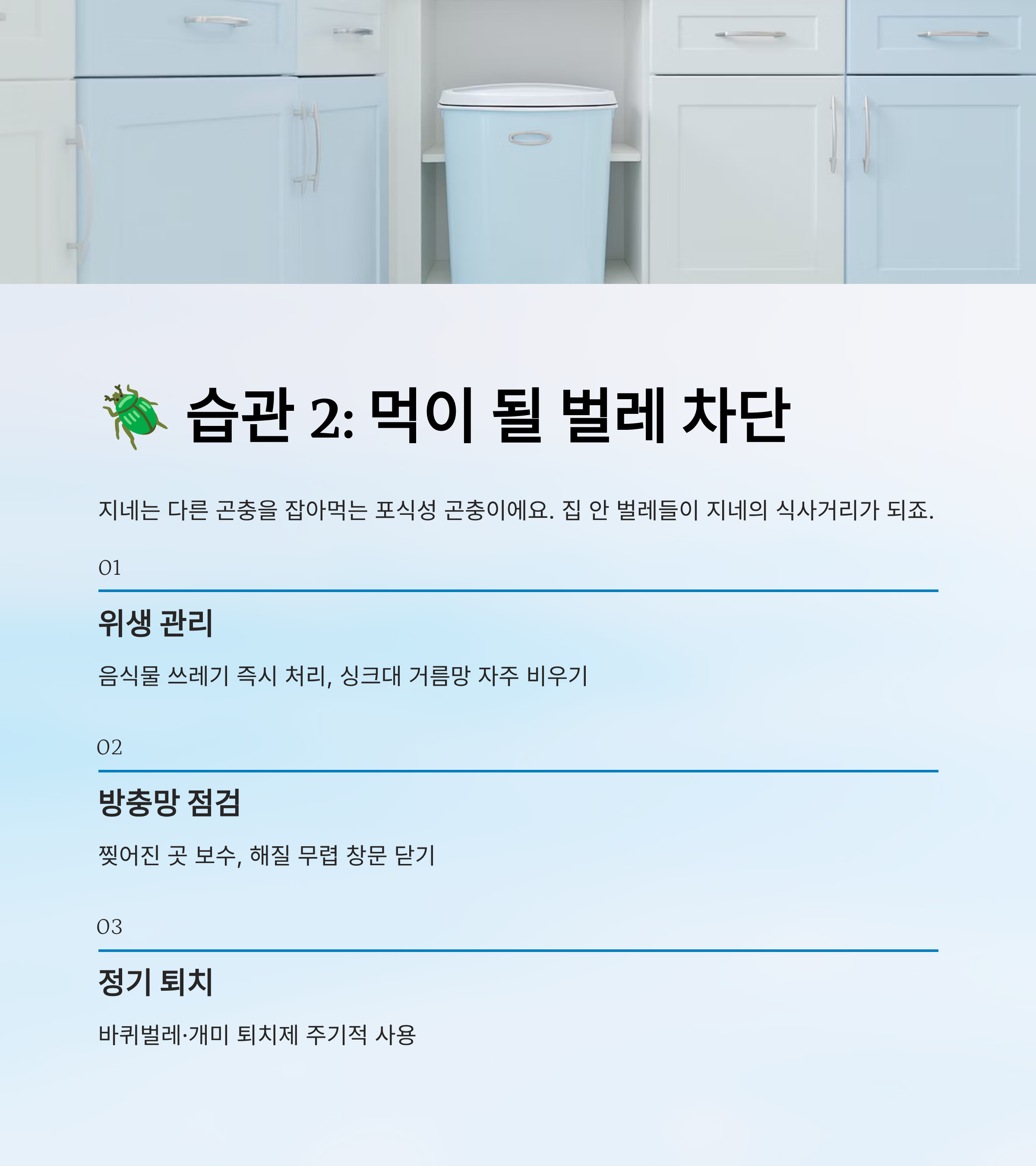 예를 들어 바퀴벌레, 거미, 개미 등이 많다면 지네 입장에서는 ‘먹을 것이 풍부한 곳’으로 인식되기 때문에 더욱 자주 출몰하게 돼요. 그러니 지네 방지를 위해선, 먼저 지네가 왜 오는지를 이해하고 그 원인을 차단하는 게 핵심이에요.